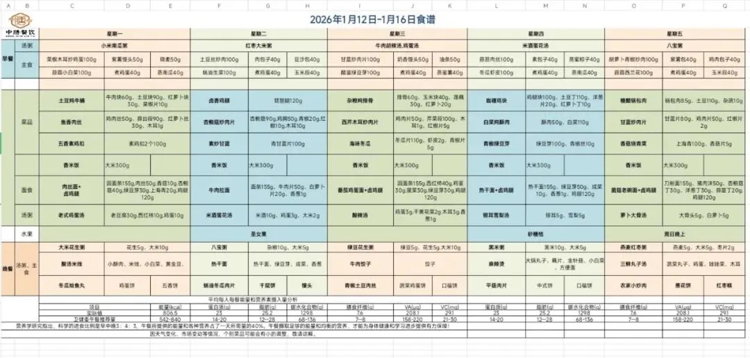 郑州市第五十七中学东校区•营养食谱【下周食谱预告】1月12日—1月16日