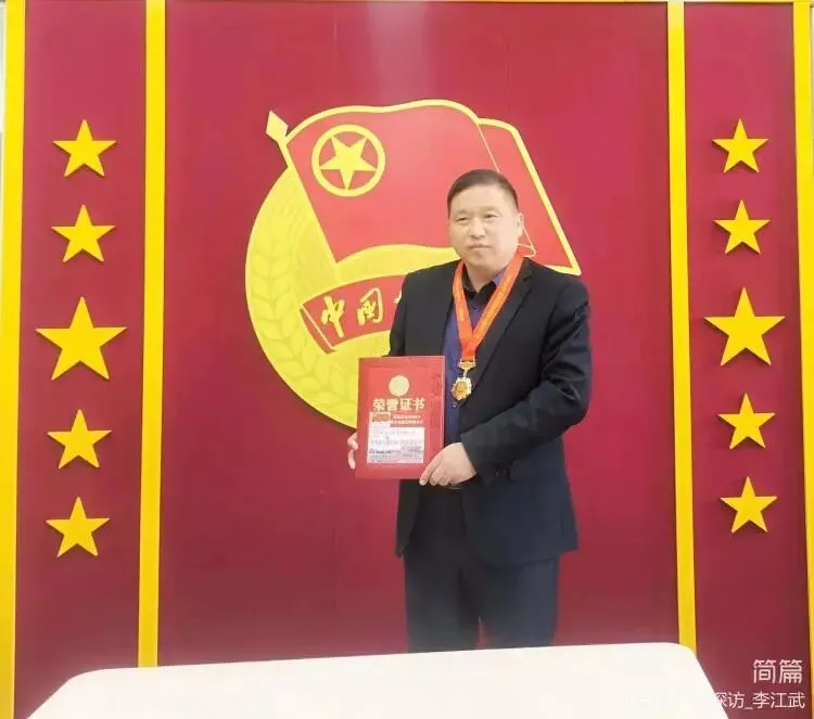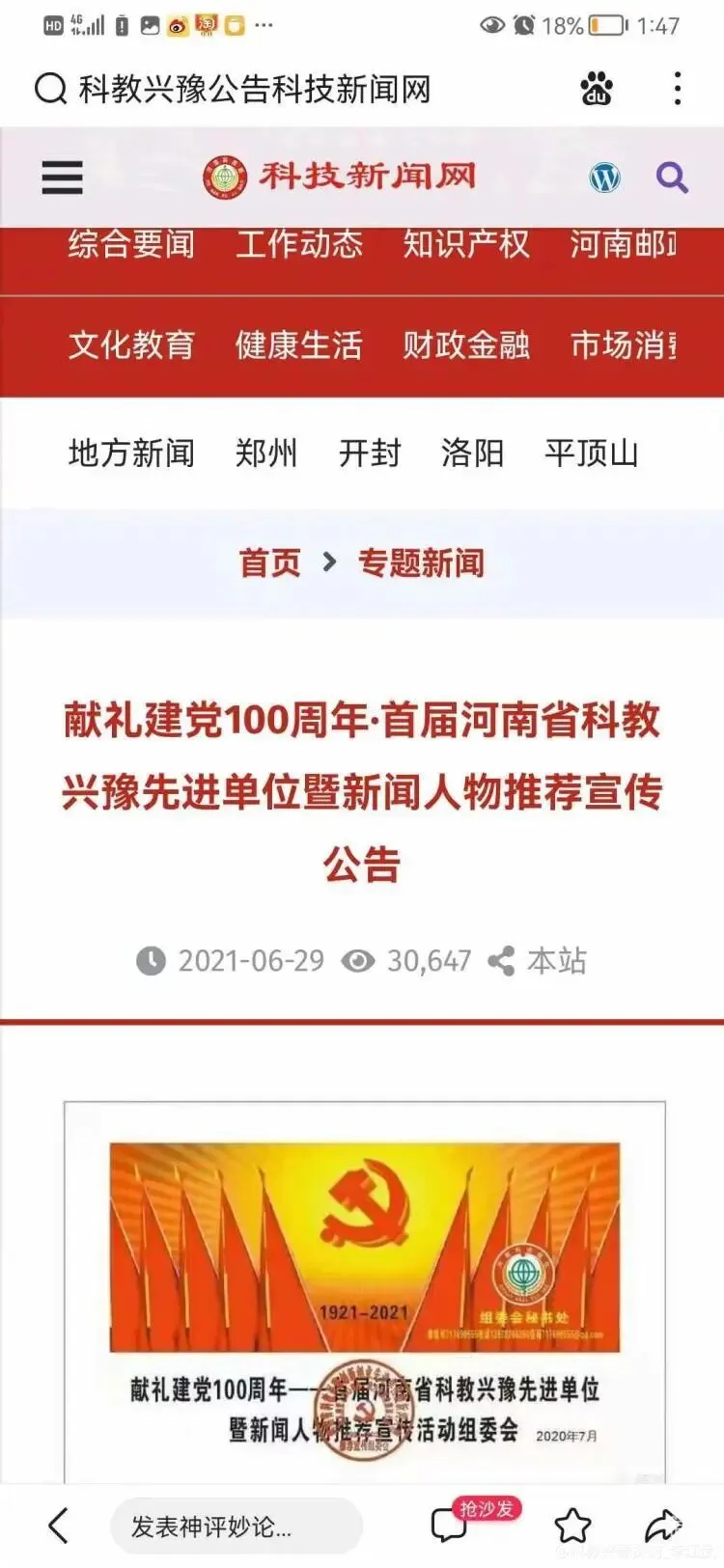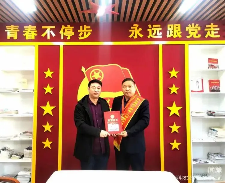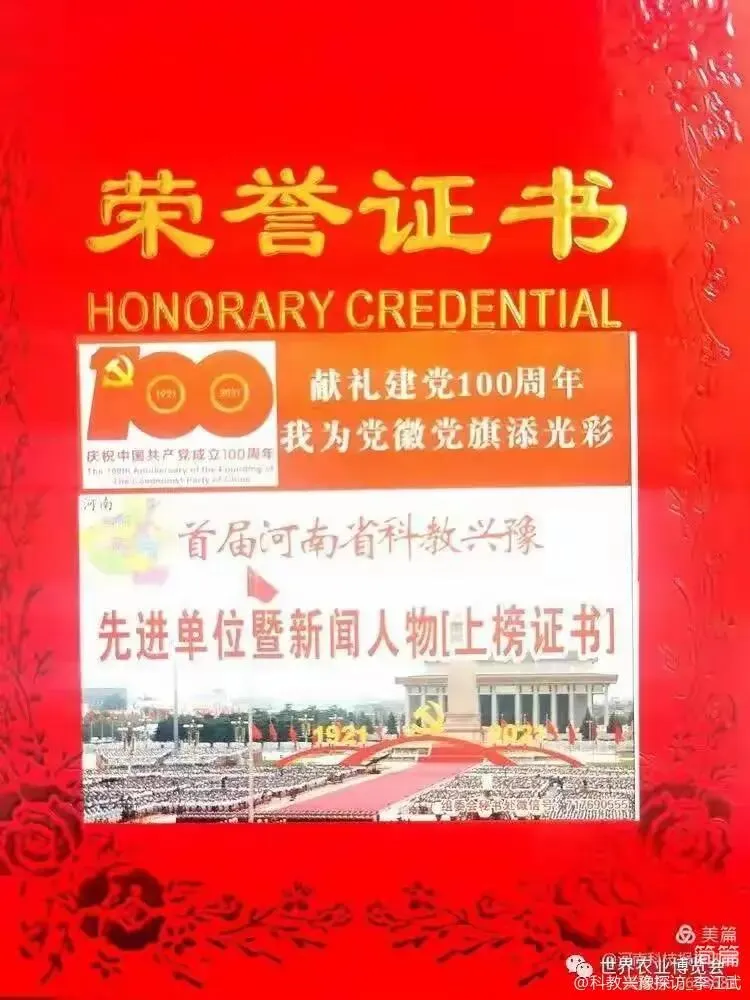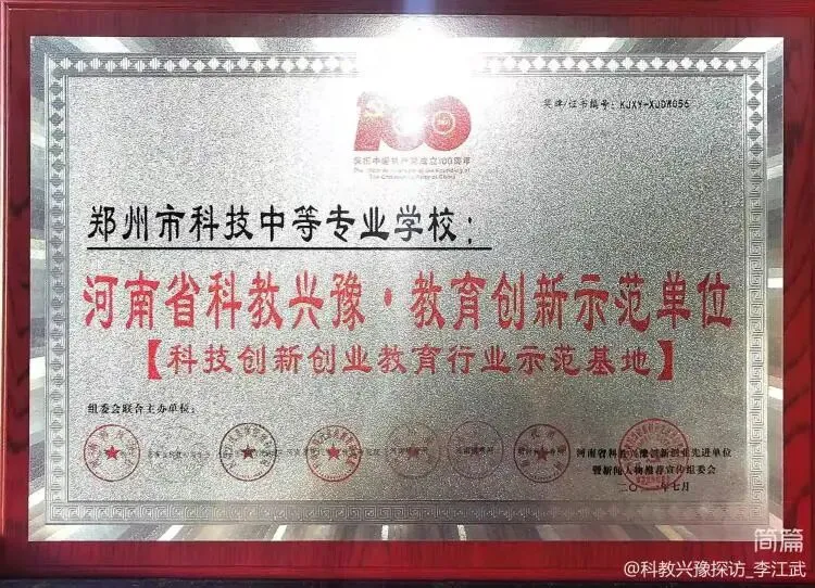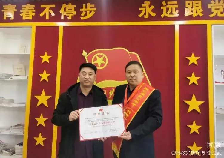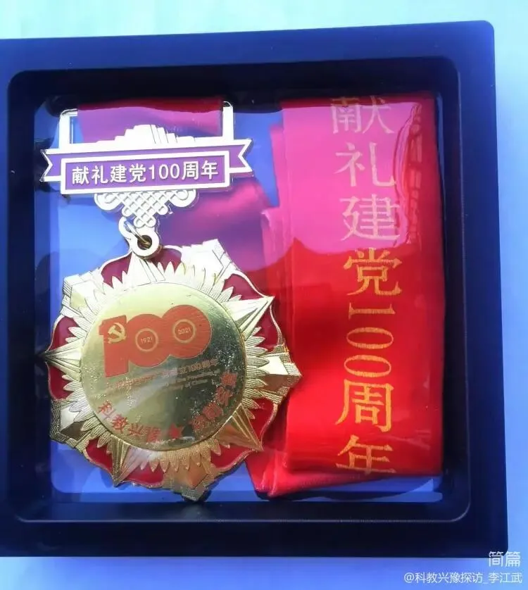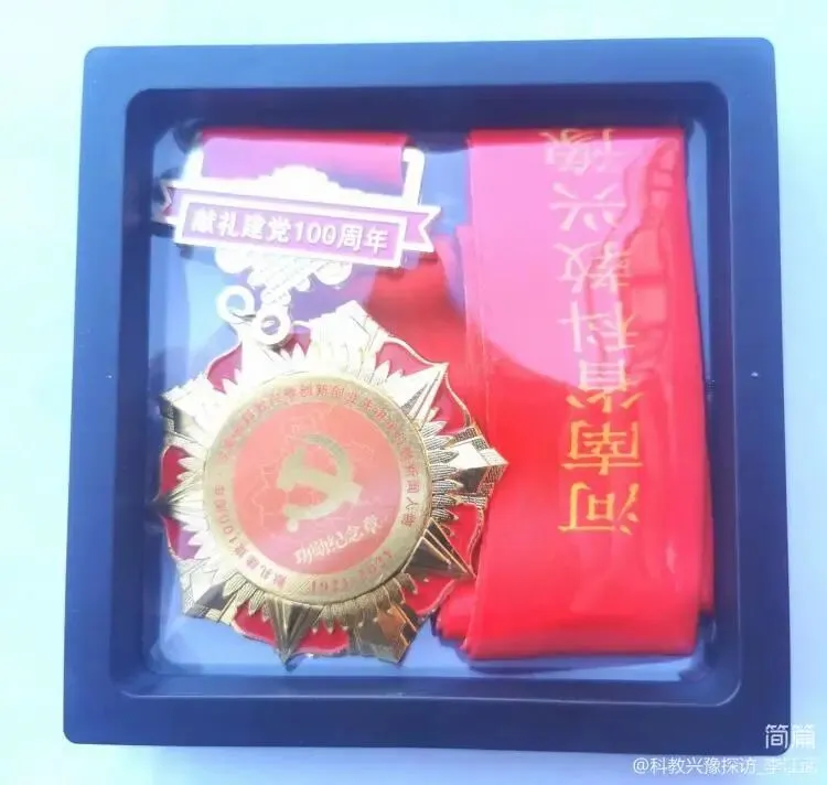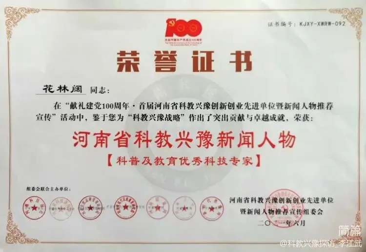 2021年11月23日,“科教兴豫新闻人物推荐宣传组委会”秘书长李江武(上图左侧)为校长花林阔(上图右侧)颁发获奖证书、荣誉奖牌及科教兴豫功勋纪念章。