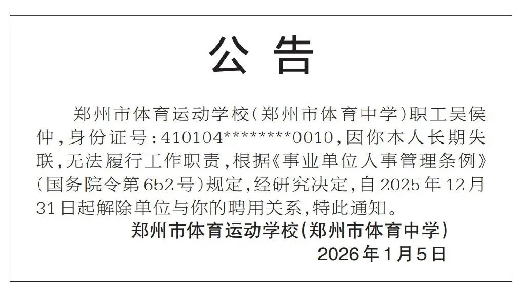 郑州市体育运动学校(郑州市体育中学)职工吴侯仲,身份证号:410104********0010,因你本人长期失联,无法履行工作职责,根据《事业单位人事管理条例》(国务院令第652号)规定,经研究决定,自2025年12月31日起解除单位与你的聘用关系,特此通知。