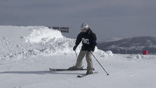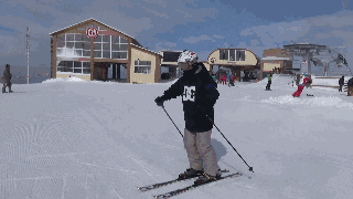 2、板尾稳住,快速移动板尖,转动身体,在移动时雪板始终呈八字状,并用边刃卡住雪面。