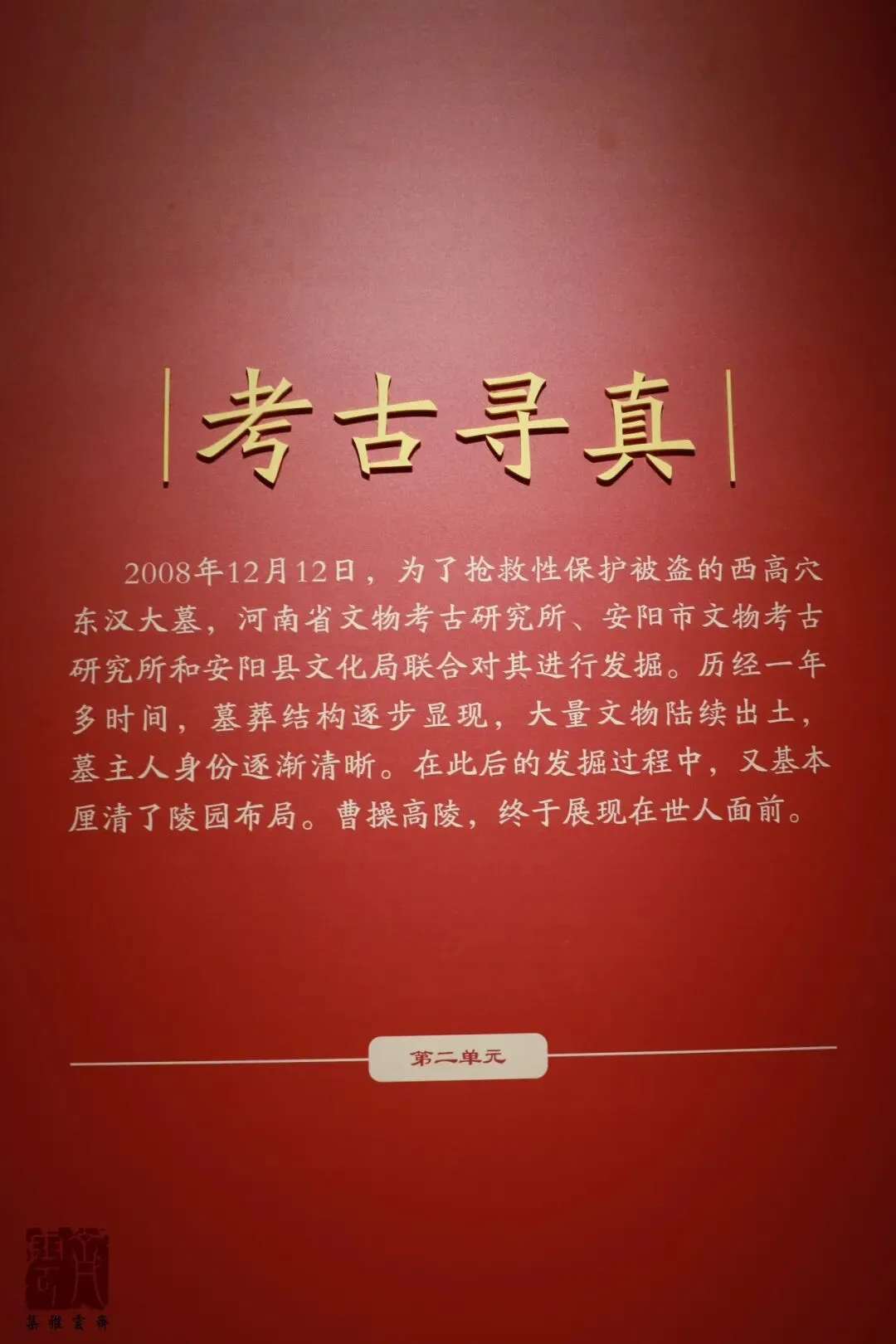 参观完曹操高陵外围和复原墓室后,就进入了博物馆内,第一个展厅名为“高陵重现”,讲述了曹操高陵抢救性发掘的始末,可以看成是整个展览的序厅。第一单元名为“发掘缘起”: