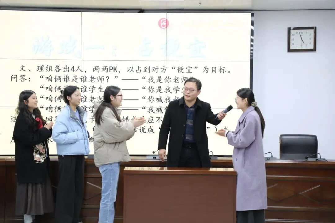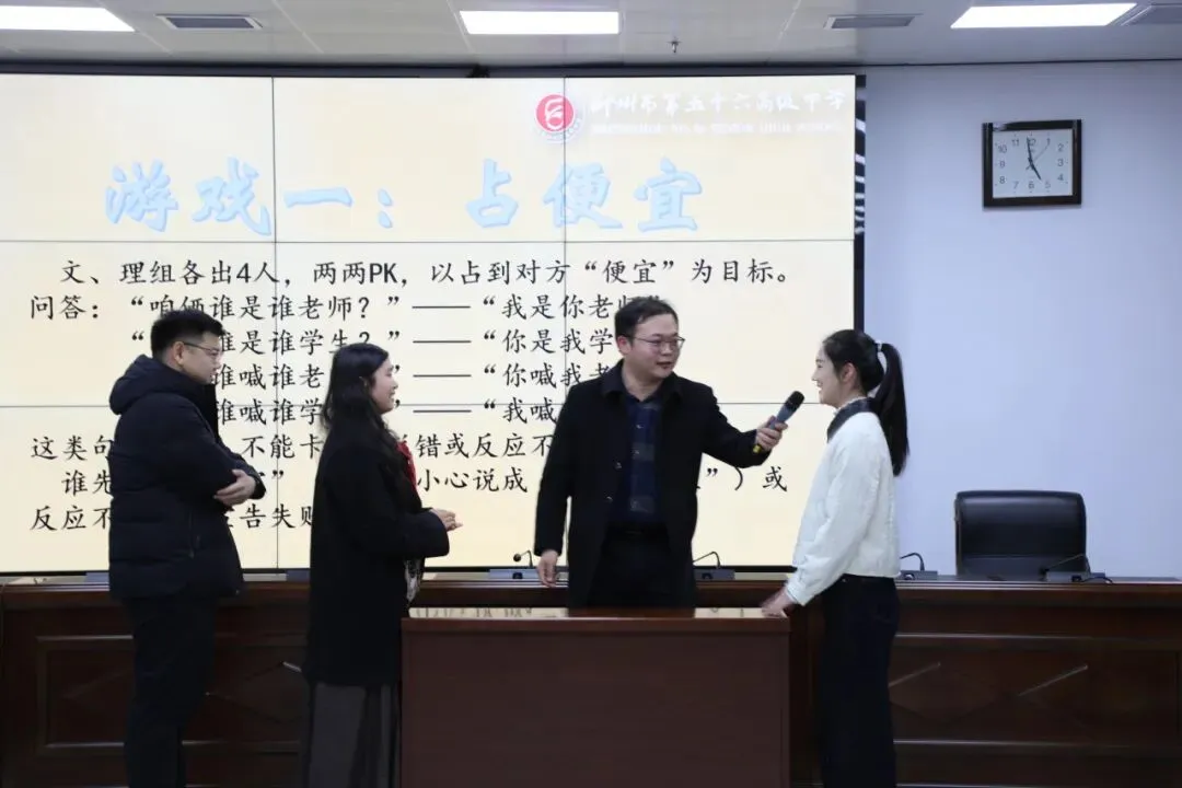 悠扬的歌声之后,现场迎来了第一个高潮——“占便宜”游戏。现场气氛紧张又欢乐,这场看似简单的语言游戏,却考验着教师的反应能力和心理素质,更在欢笑中拉近了彼此距离。