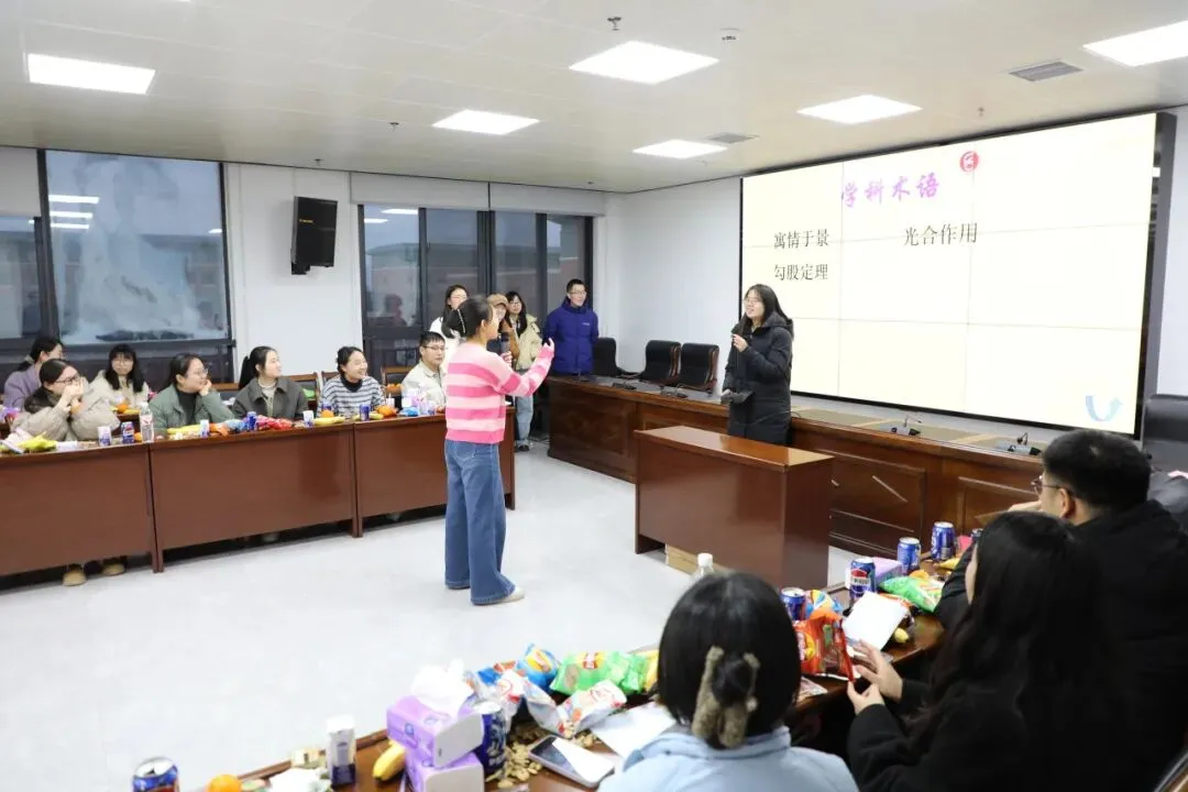“心有灵犀”游戏将现场气氛推向新的高潮。题目涵盖经典作品、成语故事、学科术语和网络热词四大类别。描述者使出浑身解数,猜词者绞尽脑汁,团队配合默契与否一目了然。理科组教师也精心准备,在展示环节结束后,数学、物理、化学、生物学科的新教师们分享了他们的教学故事。一位化学教师谈到过去半年里自己的蜕变,脸上洋溢着自豪的笑容。每个人的故事虽然不同。但都充满了对教育事业的热情和对未来发展的期待。