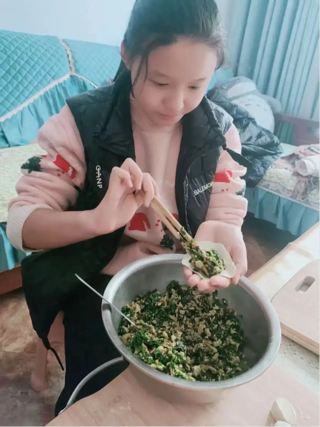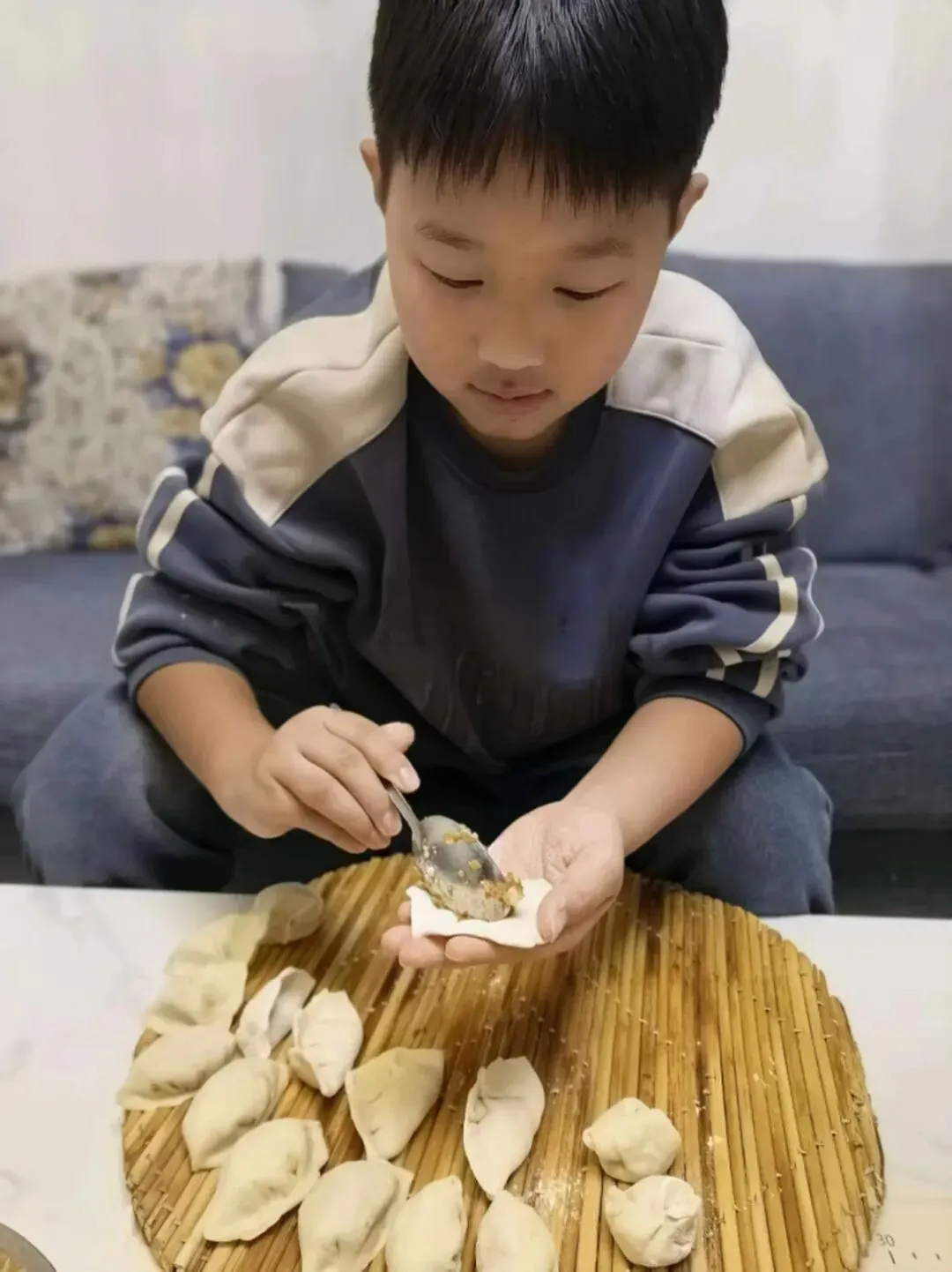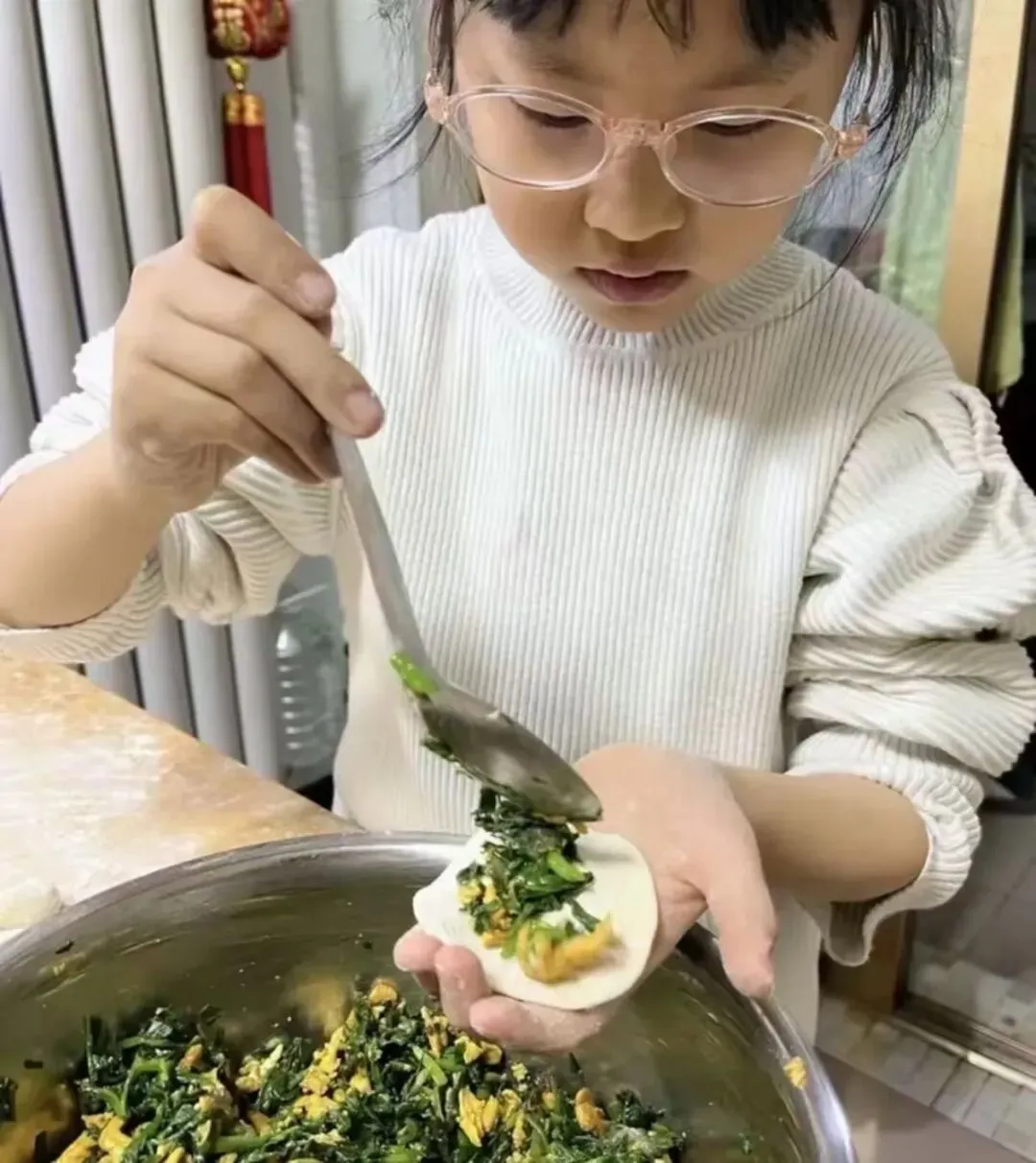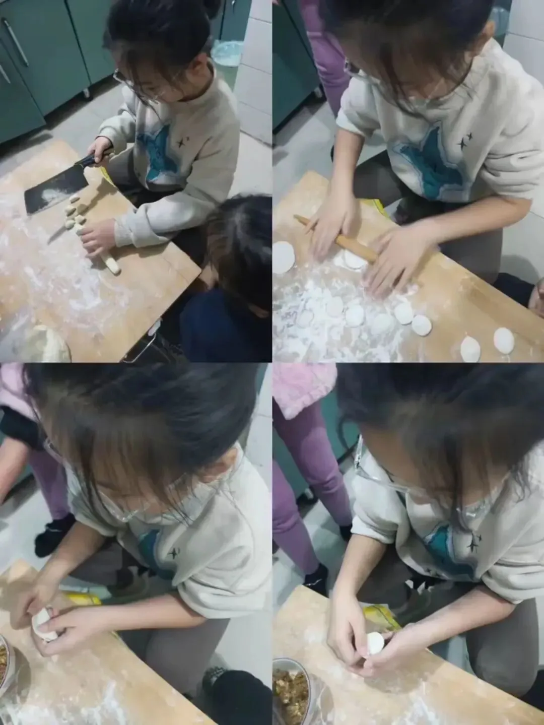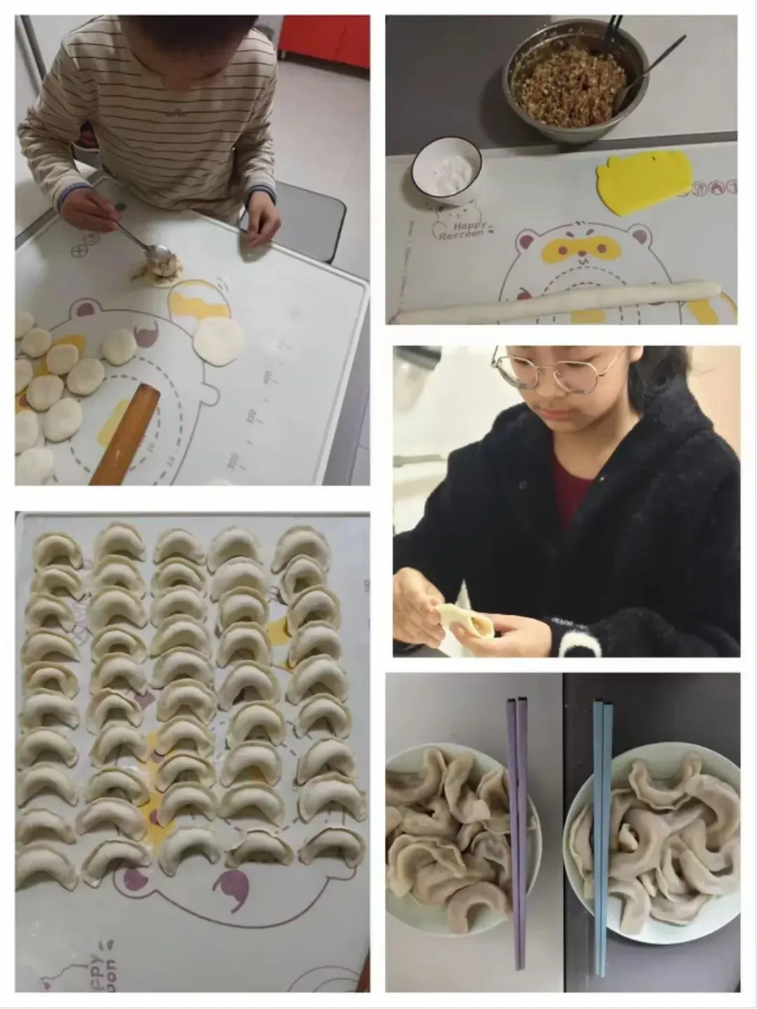活动中,队员们化身“劳动小能手”,和家长分工协作:有的揉面擀皮,手法稚嫩却格外认真;有的创意包馅,捏出月牙形、元宝形等各式各样的饺子。擀面杖的滚动声、欢声笑语交织在一起,一个个饱满的饺子摆满案板。下锅煮熟后,队员们品尝着自己亲手包的饺子,脸上洋溢着自豪与满足。大家在擀、包、煮的过程中,不仅掌握了包饺子的劳动技能,更体会到了家人协作的温暖,感悟到“冬至大如年”的团圆意义。