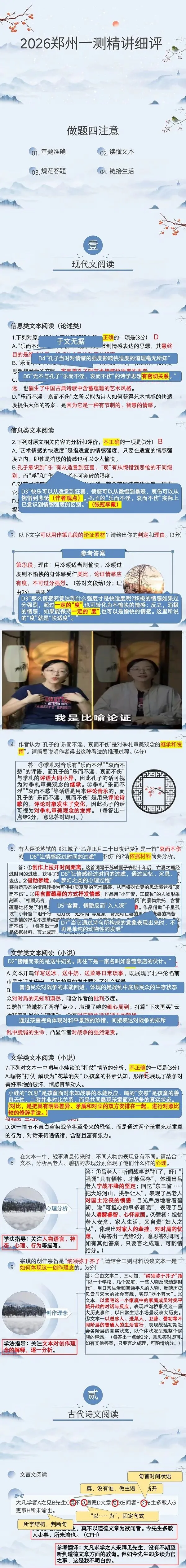 1.(3分)D(A项于文无据。“其最终目的是维护礼教,维持社会政治秩序的稳定”有误。B项曲解文意。“寄寓着孔子对艺术情感快适度的思考”有误。C项“也催生了中国古典诗歌中含蓄蕴藉的艺术风格”理解有误,原文“与孔子的‘乐而不淫,哀而不伤’的诗学思想有密切的关系”并不意味着是“乐而不淫,哀而不伤”“催生”了中国古典诗歌中含蓄蕴藉的艺术风格。)