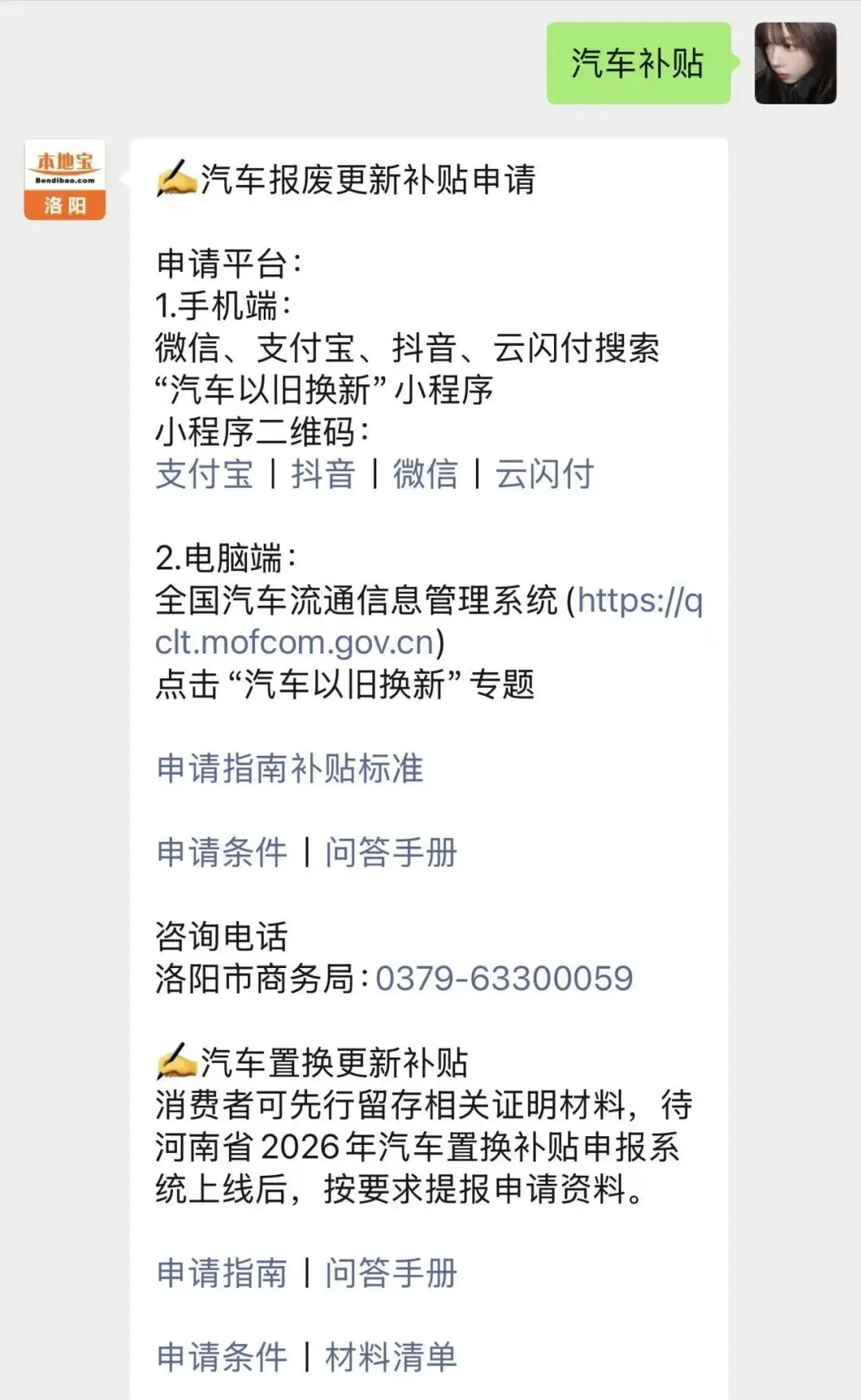 温馨提示:进入【洛阳本地宝】公众号,在聊天框发送【家电补贴】,即可查看家电数码补贴参与方式、平台入口、商家查询等。