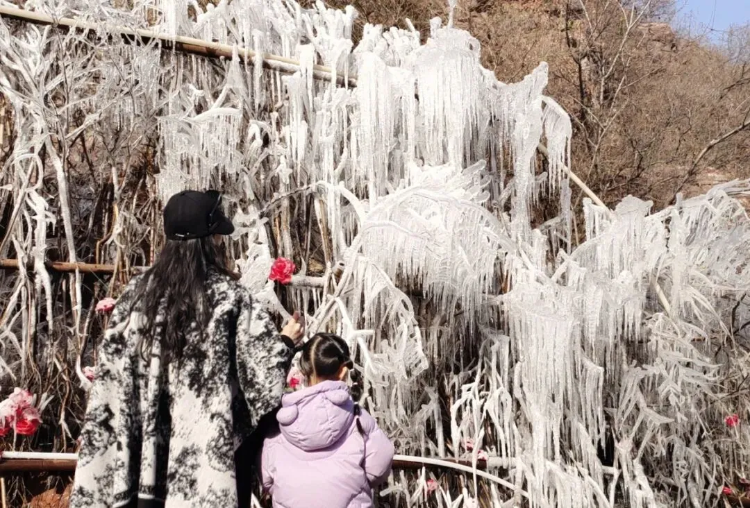 旅游年票在这里是可以用的,不过每人需要花五元钱买保险,再刷下年票电子码就能凭小票进入景区。进入景区工作人员笑着告诉我们,早上的冰挂视觉效果最好,晨光洒下来时,冰面会泛出亮晶晶的光,不过路滑拍照要注意安全。