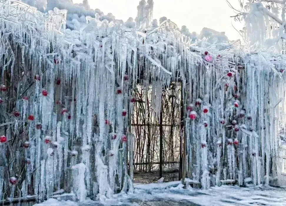 这般美景,离不开景区工作人员的精心布置。人工造雪与自然冰挂相映成趣,石阶旁、树丛间,处处皆是巧思。女儿兴奋地跑到冰柱下,伸手轻轻触碰,又赶紧缩回来,咧着嘴喊:“好冰!好滑!”女儿则踮着脚尖,仰着小脸打量那些垂落的冰棱,小声嘀咕:“比三爷家的冰柱大了好几倍!”