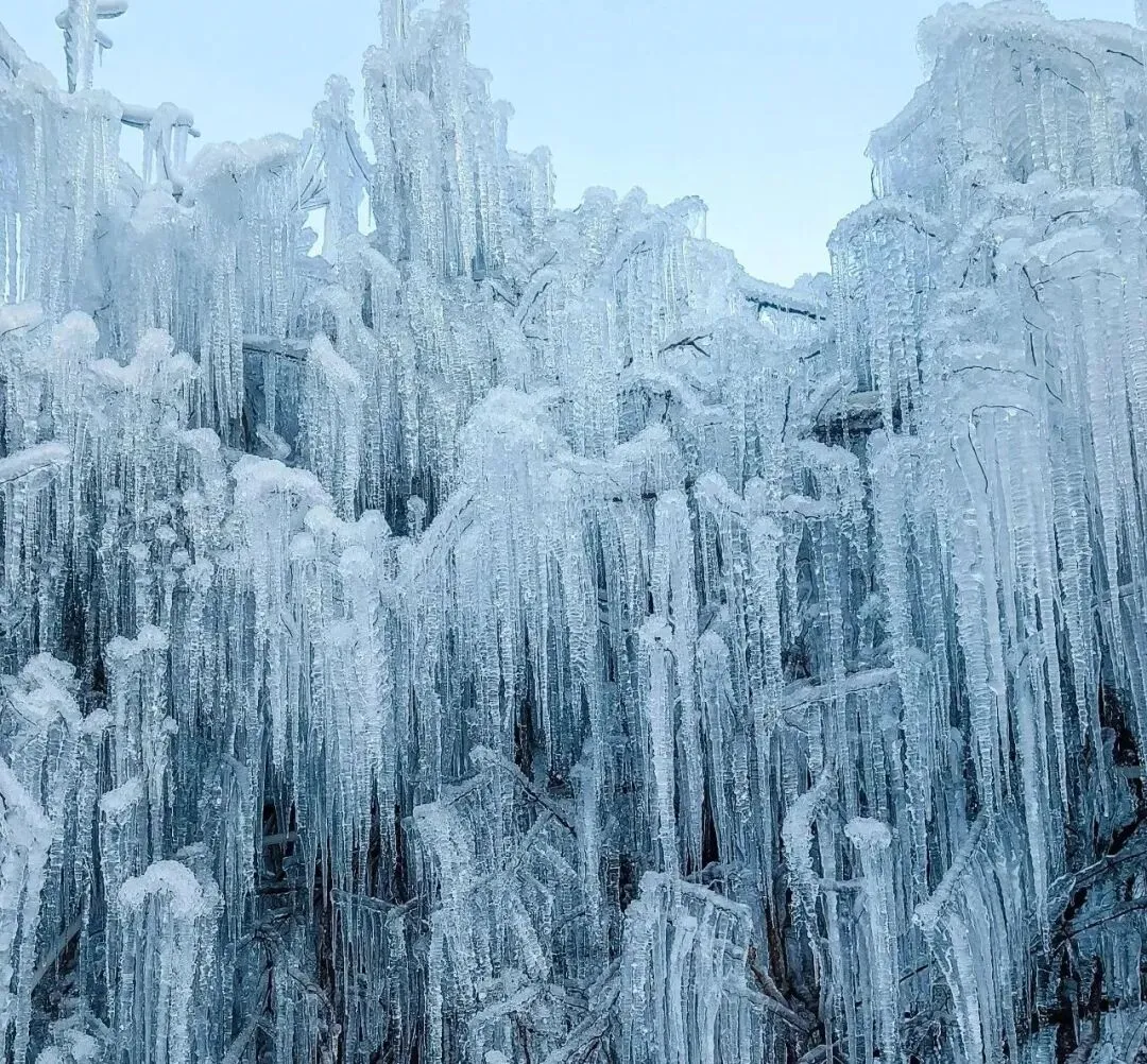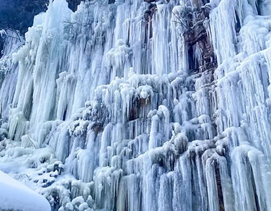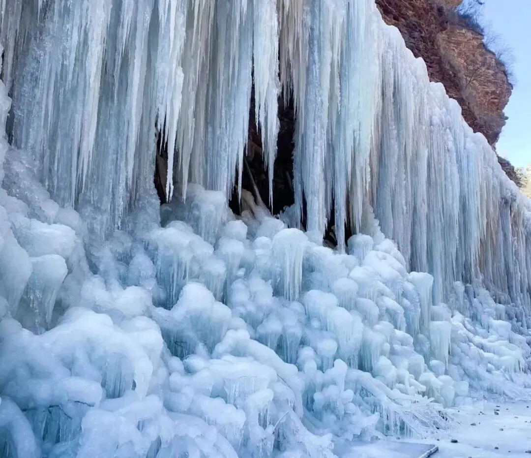 果然,当我们踩着石阶走进山谷,瞬间就被眼前的景象惊艳了。往日里潺潺的溪流,此刻凝结成形态各异的冰挂,有的如利剑垂悬,有的似玉帘轻垂,阳光穿透冰层,折射出晶莹剔透的光芒,宛如闯进了童话里的冰雪王国。