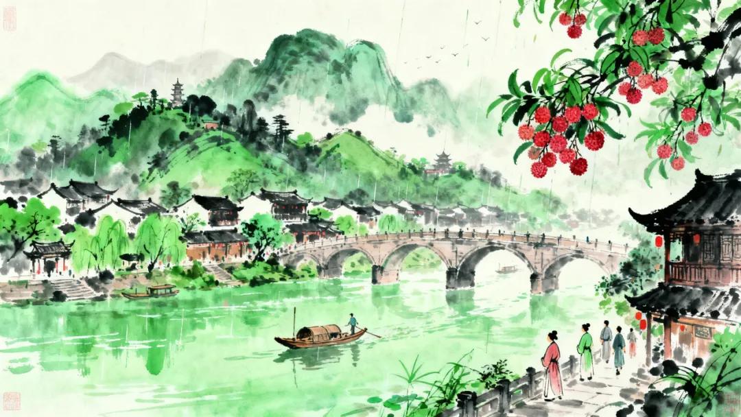 新雨刚停,锦江西边烟波浩瀚江水碧绿,山头上,荔枝刚熟,清香飘满山岗。