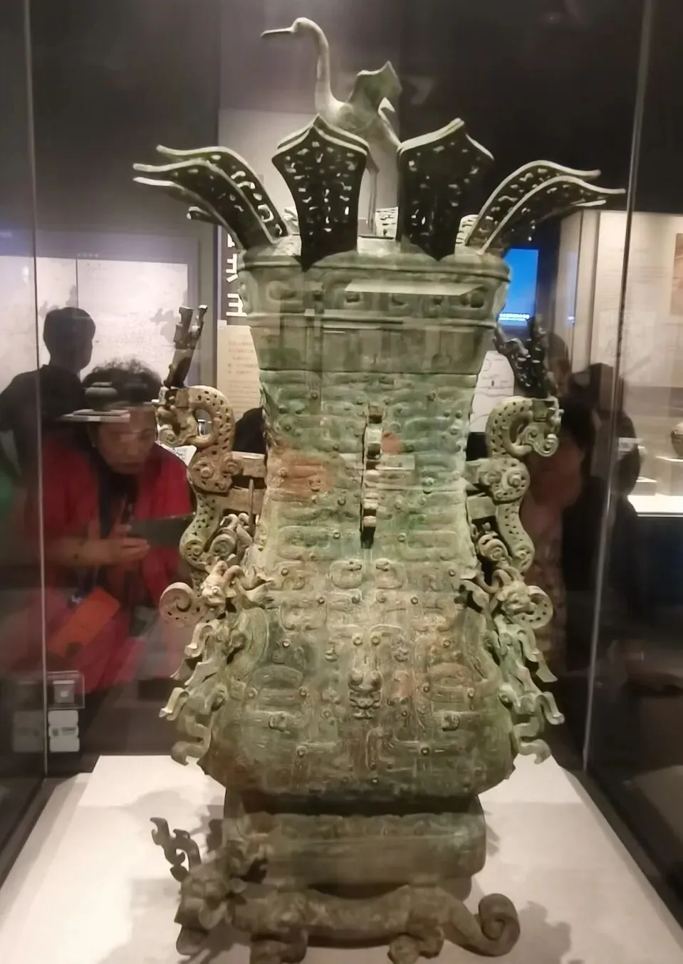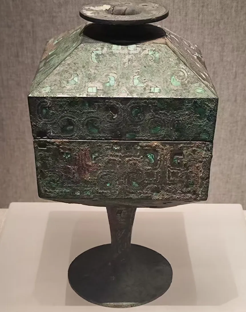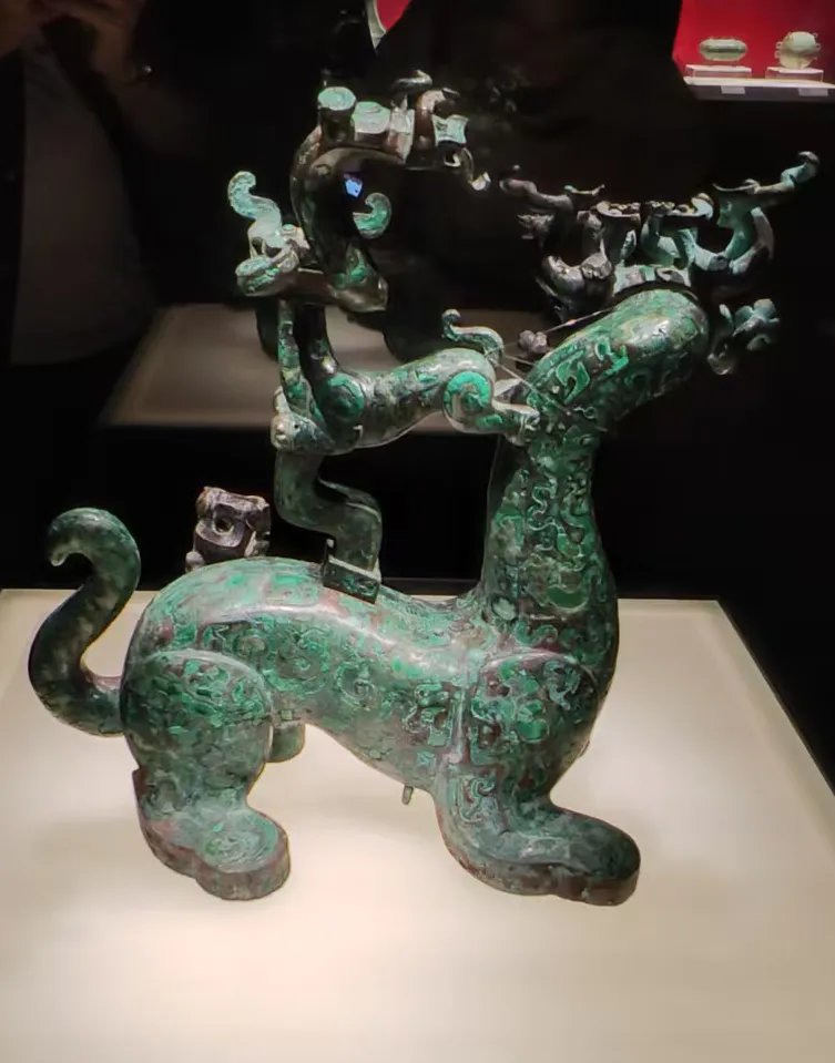 在宝鸡青铜器有不少四耳方座簋,鼎簋制是西周墓葬的标配,可是楚国出土的簋一点都不庄重,但是说是艺术品一点也不违和。还有镶嵌绿松石的神兽,像三星堆的青铜造型。