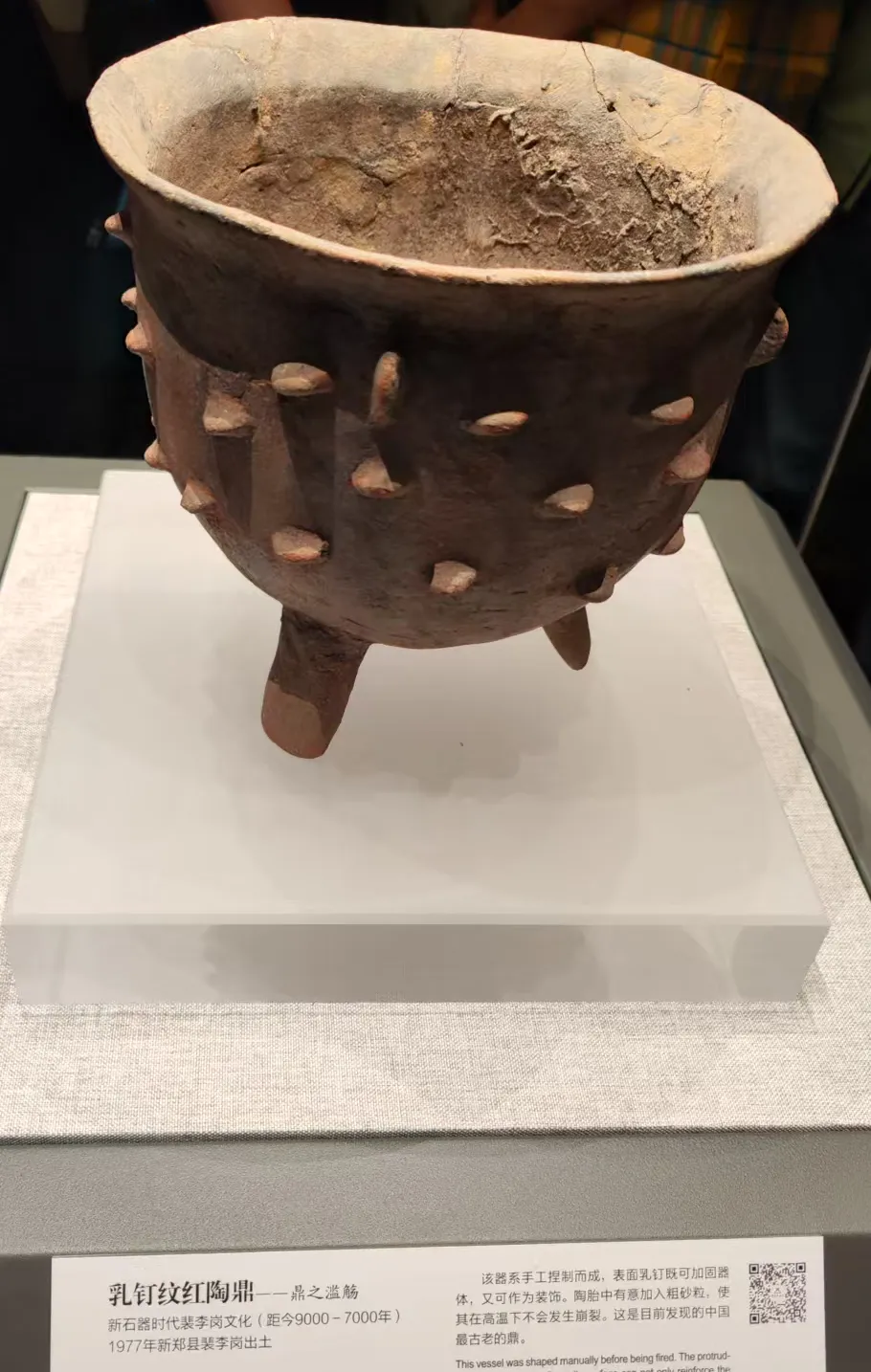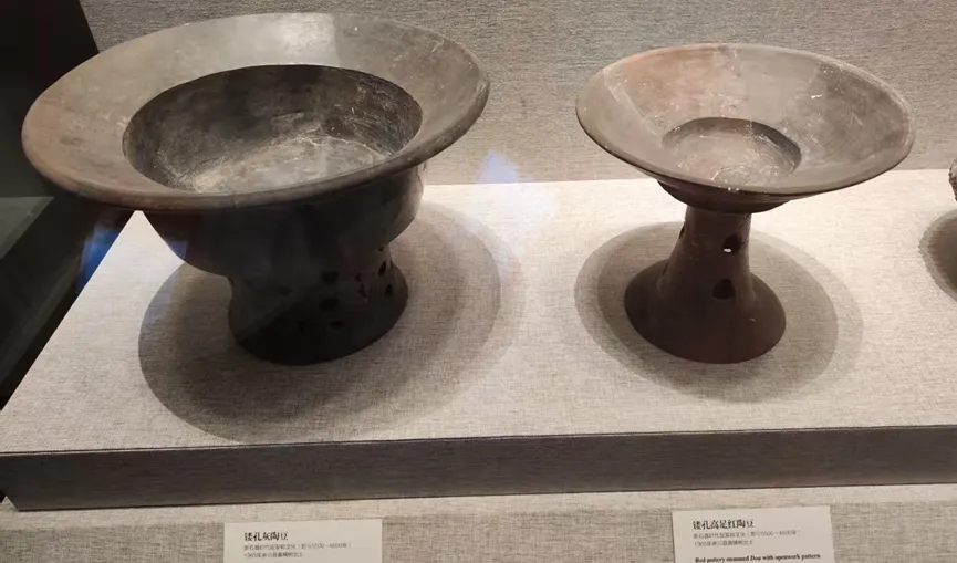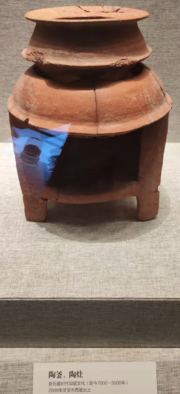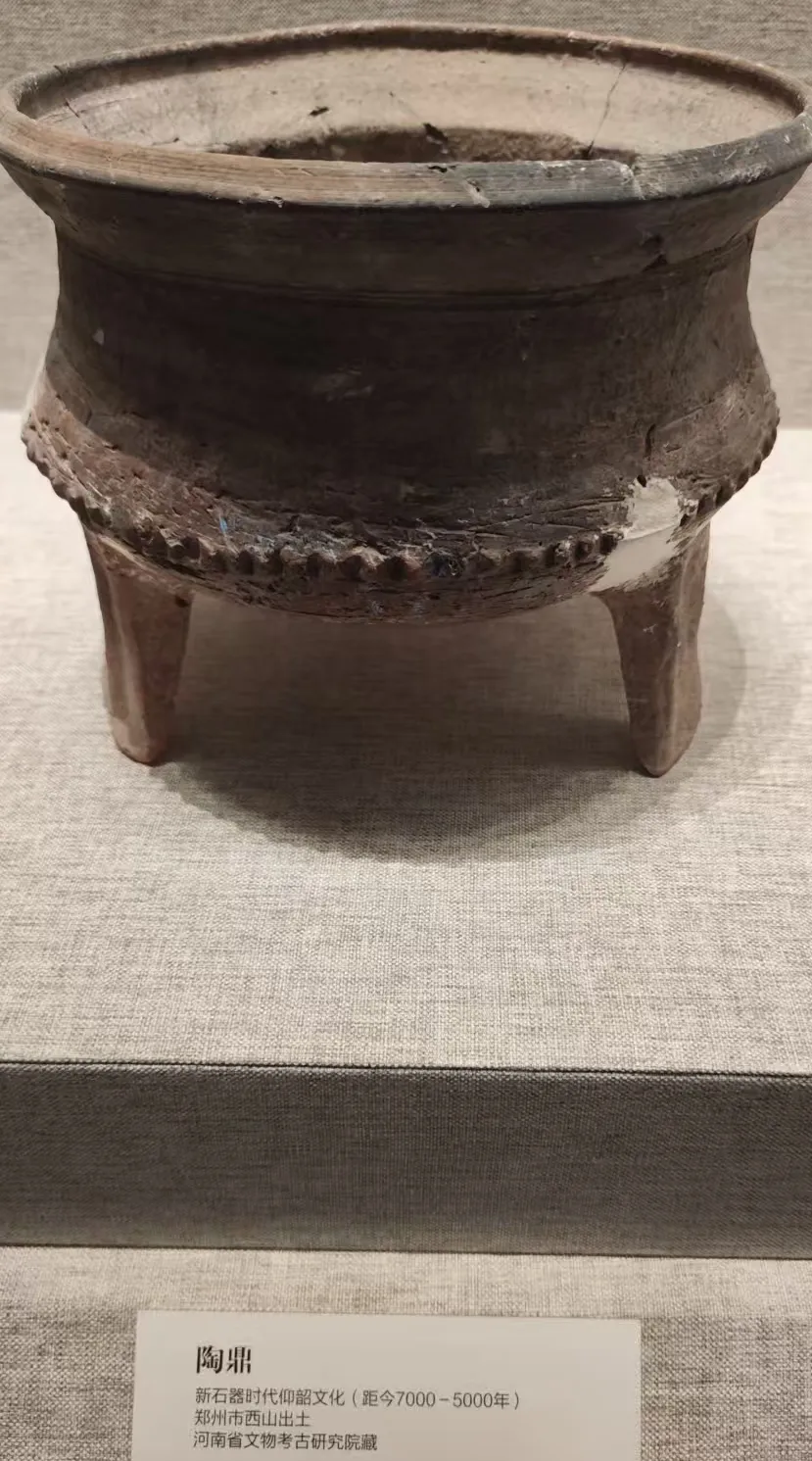 记得在山西运城开车时候路过的村落写有大禹、舜故里这样的标记。说明山西南部地区是原始氏族社会的聚集地。与山西南部隔着黄河的洛阳地区也是原始氏族人类的聚集地。看河南省博第一个展厅的原始社会陈列的文物,应该是没有间断。裴李岗文化最早,距今9000年乳钉纹陶鼎、陶豆,尤其是这个陶豆比山东省看见的还要大。
