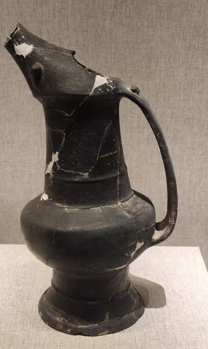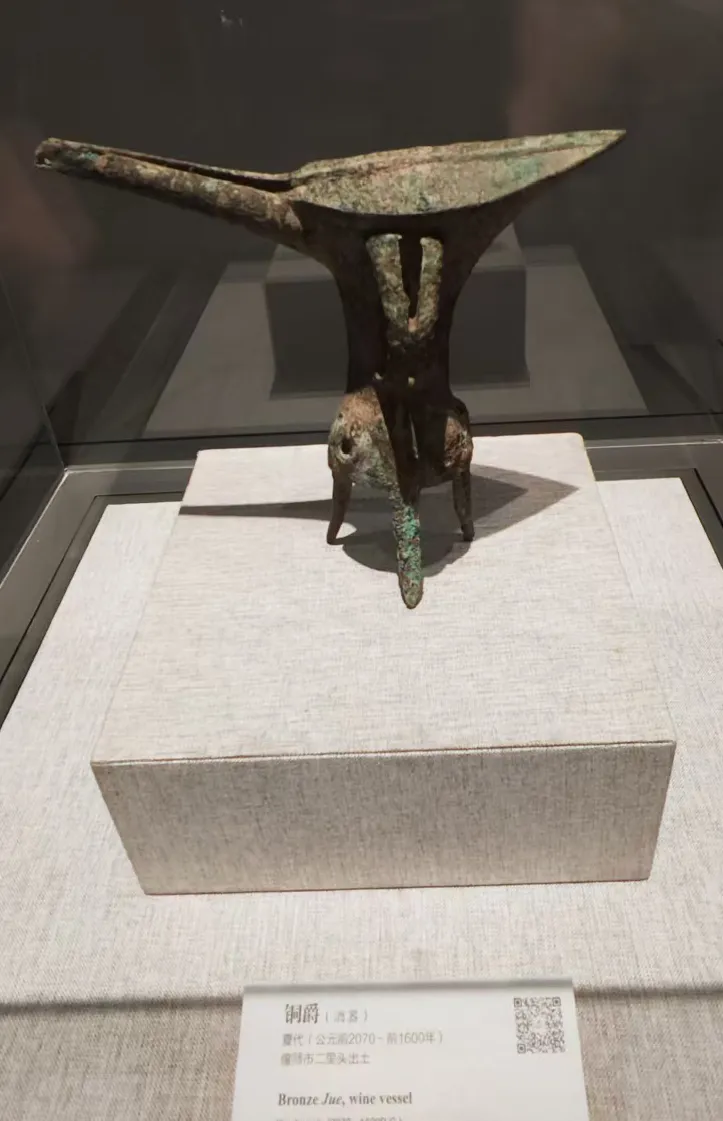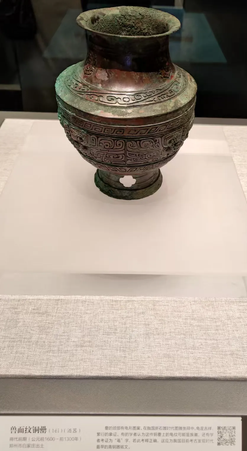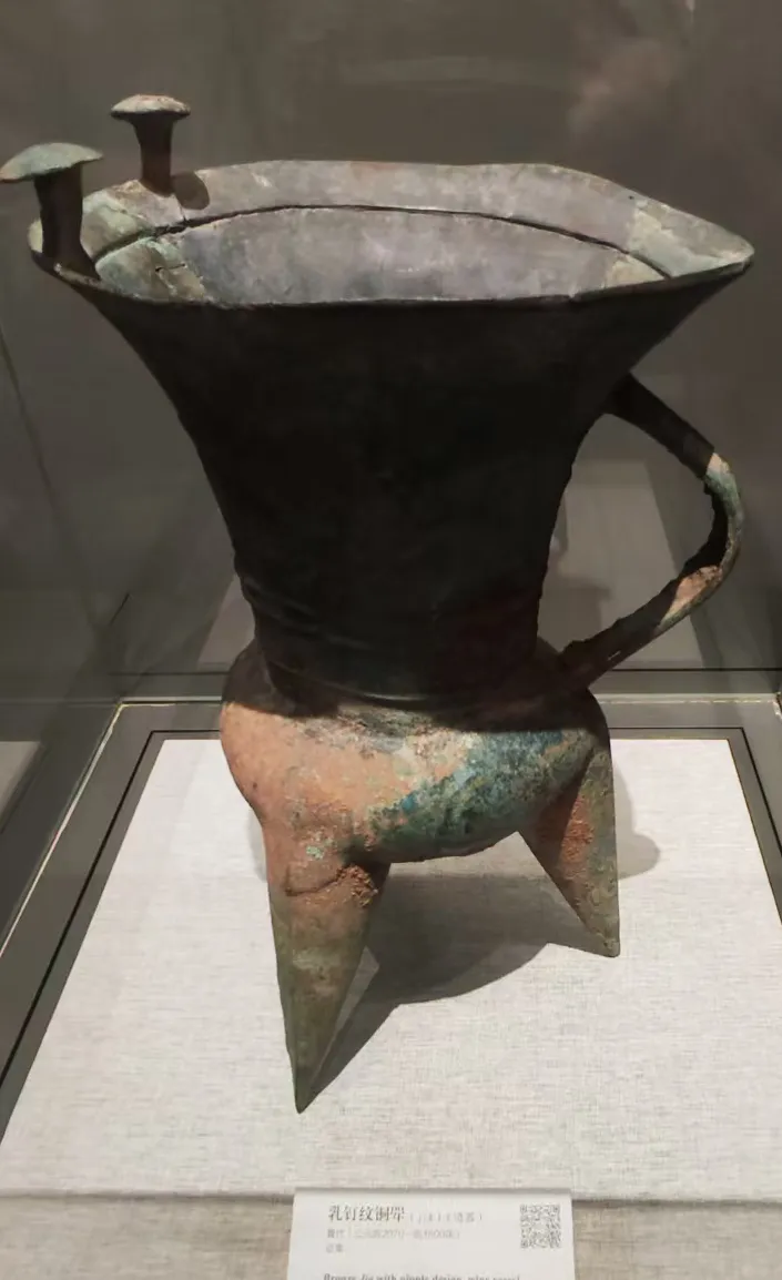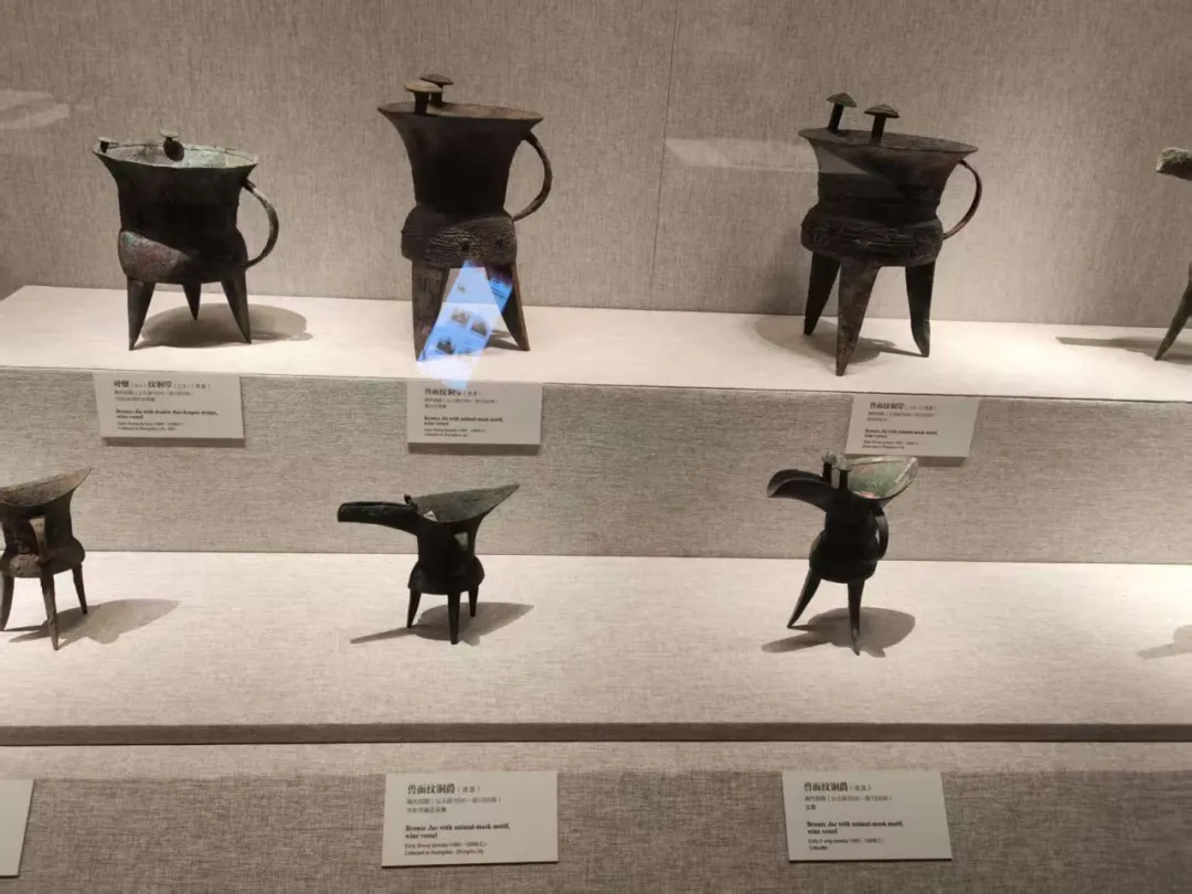 山西陶寺遗址、陕北的石峁遗址、良渚遗址都是原始人类聚集地,但是能被认定的属于夏朝的恐怕还是河南的二里头。这次参观看到了巩义等洛河地区也有不少夏朝的遗址出土的陶器。这个黑陶壶形盉的封口如昂首的雄鸡,是夏朝祭礼用的器物:鸡彝,是夏史有力的证明。右边的是乳钉纹的铜斝。
