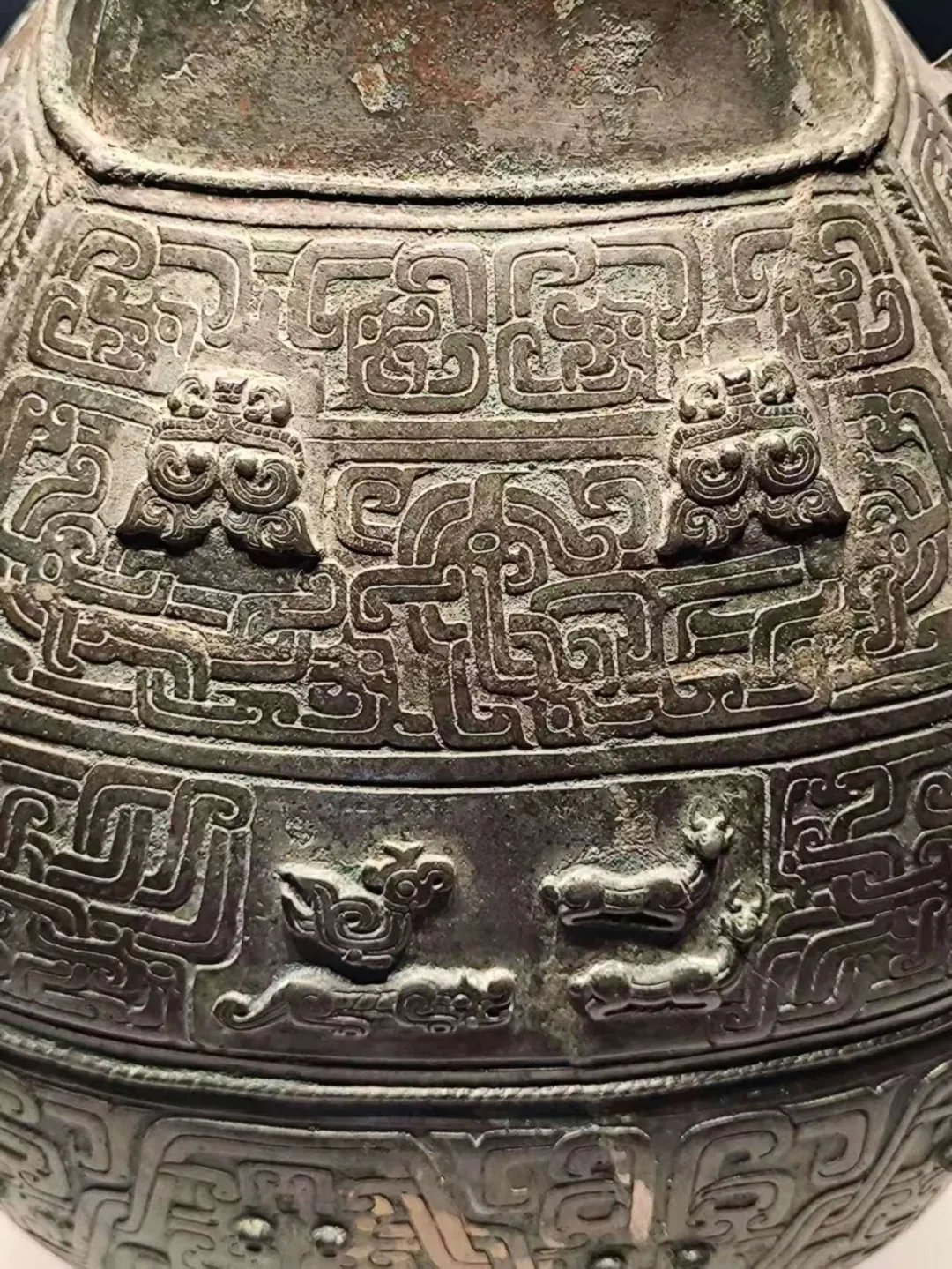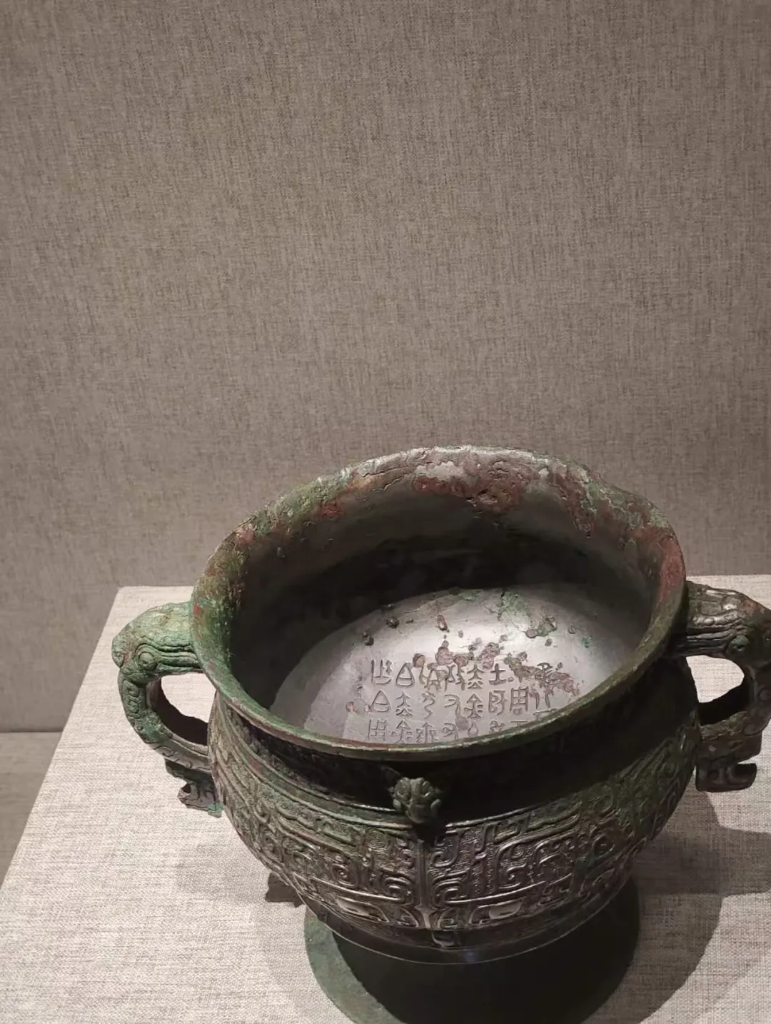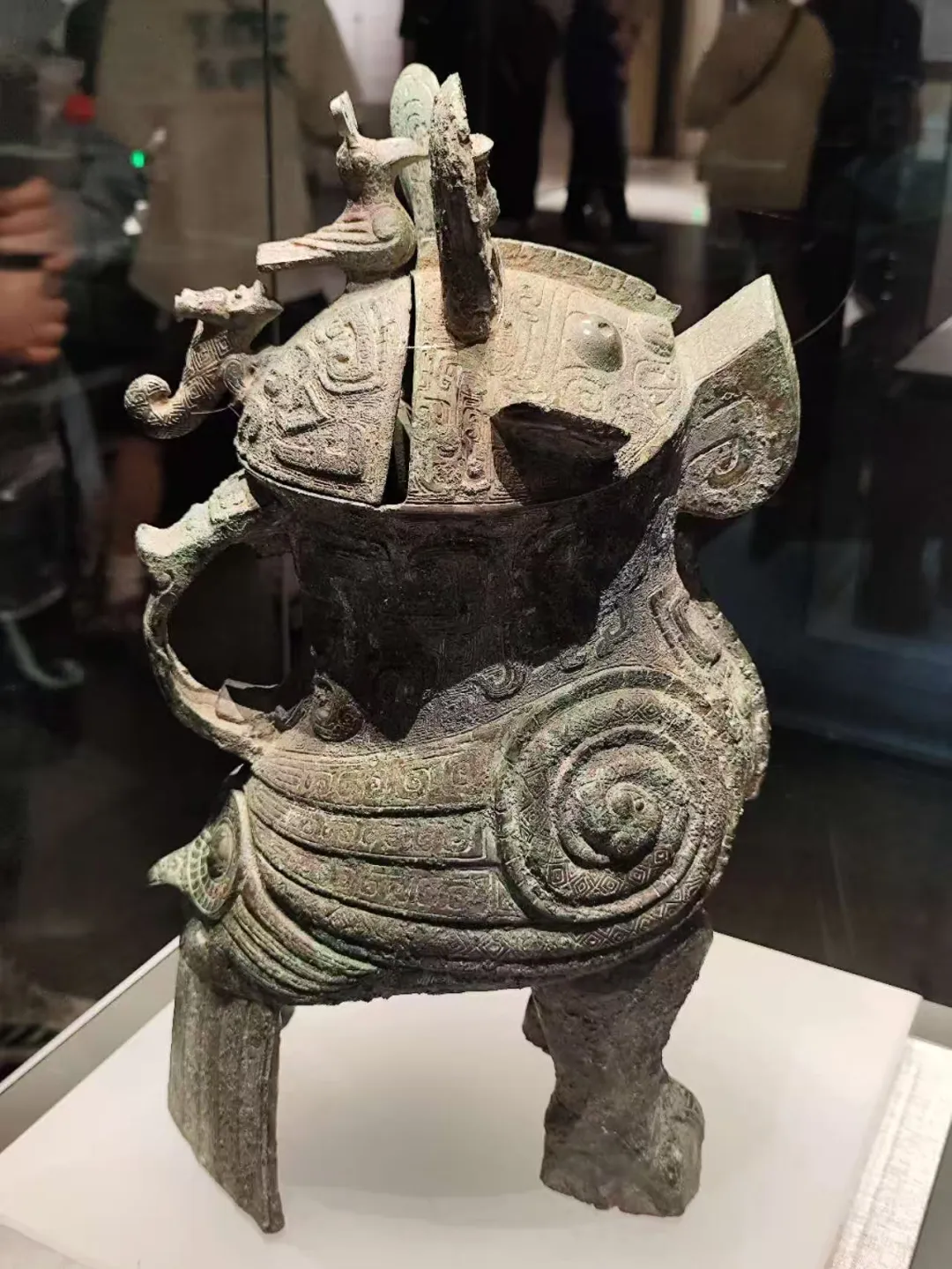 下面就是殷墟的青铜器,最好看的自然是觥、尊。后母辛的觥,前面是兽头,尾部是鸟状,我努力的看,兽头觉得是牛头,尾部只看到了鸟翼状的纹饰。