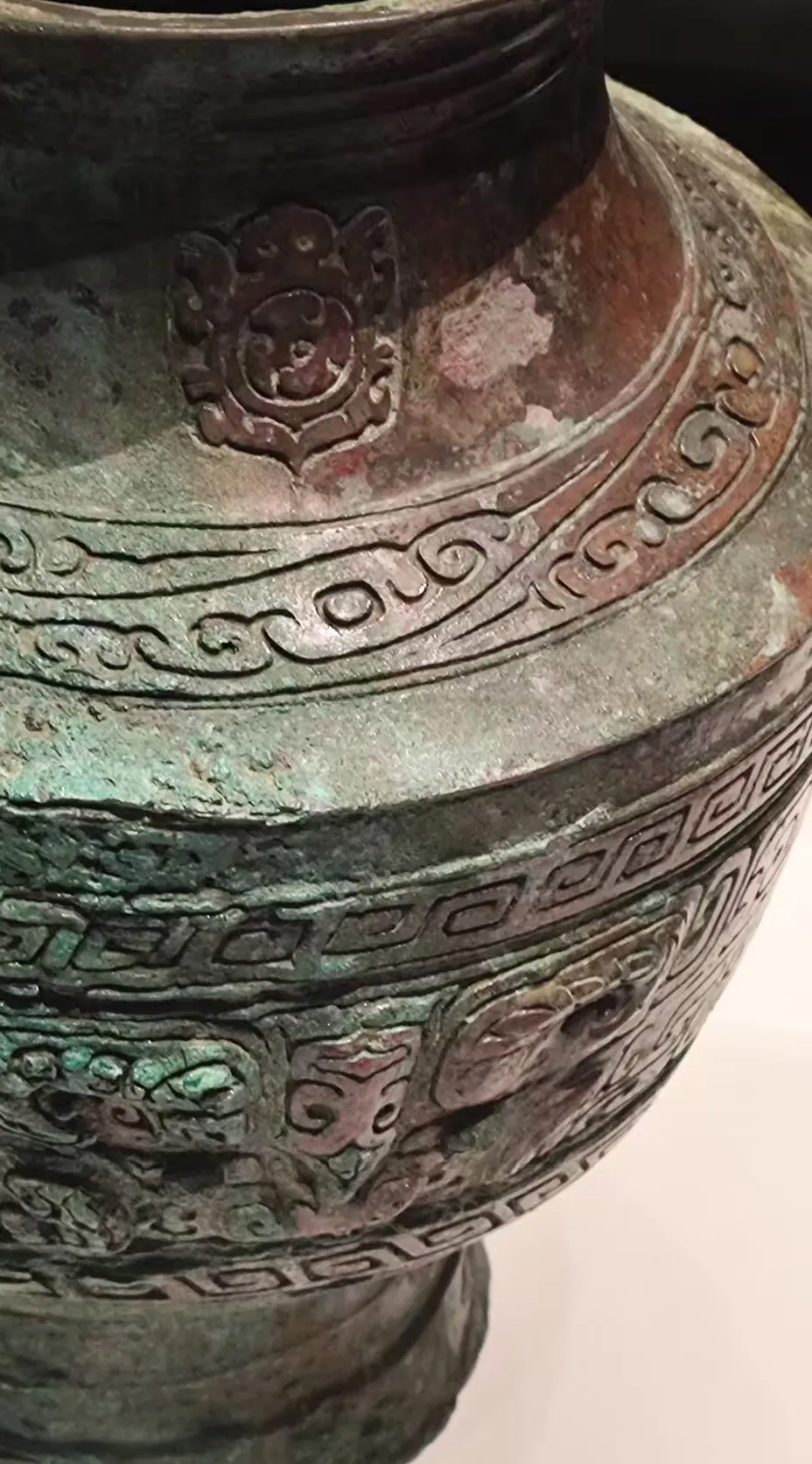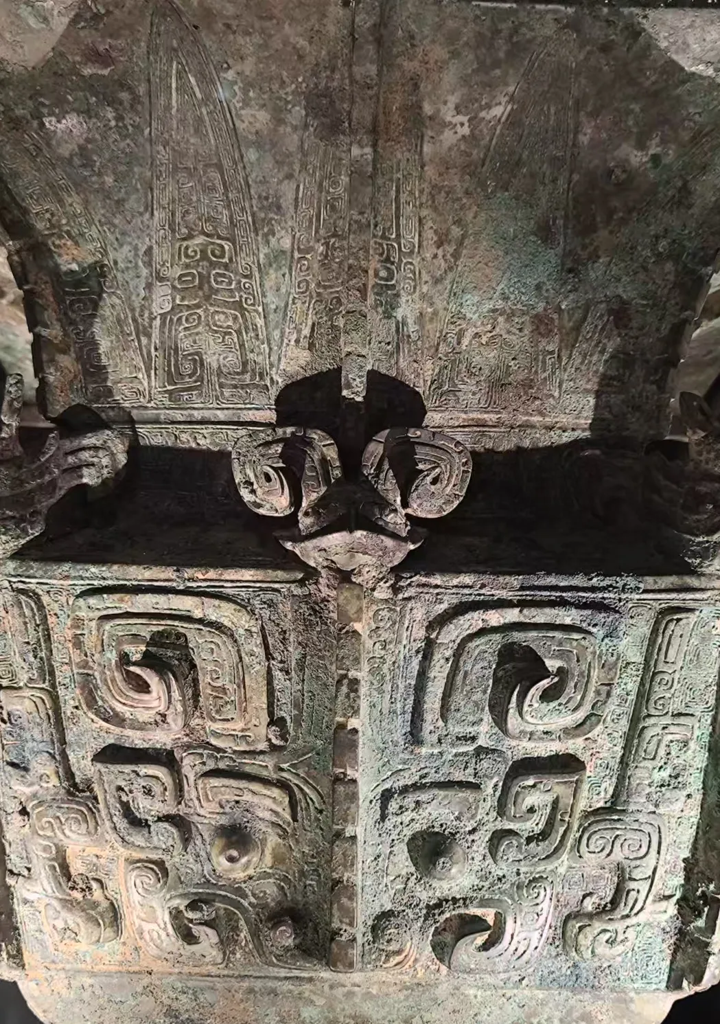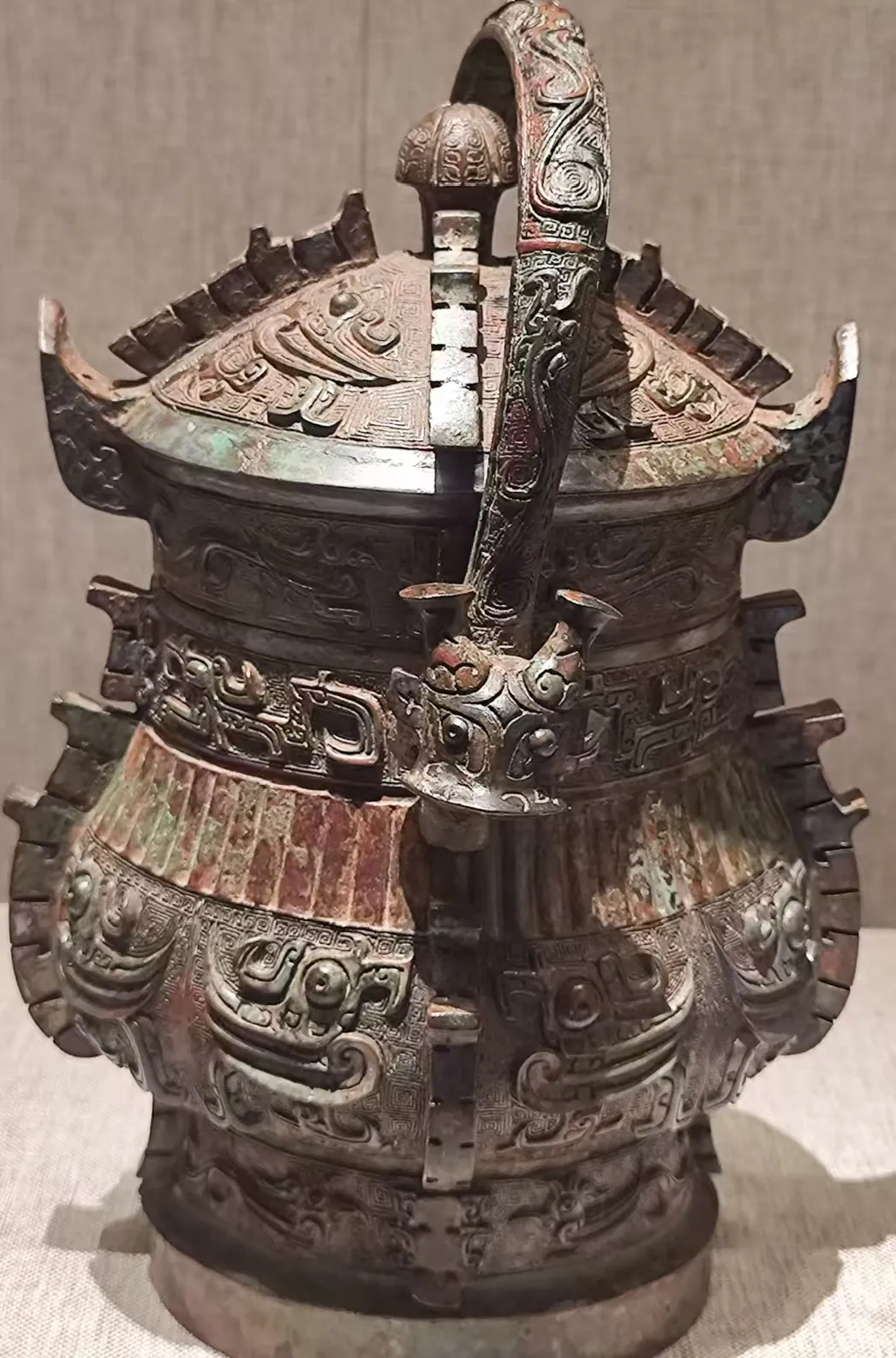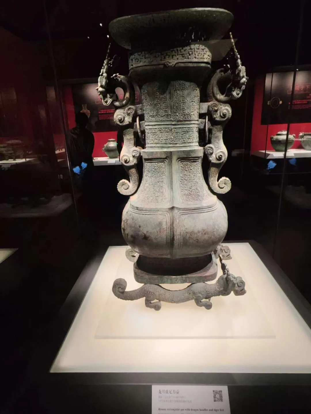 下面就是殷墟的青铜器,最好看的自然是觥、尊。后母辛的觥,前面是兽头,尾部是鸟状,我努力的看,兽头觉得是牛头,尾部只看到了鸟翼状的纹饰。