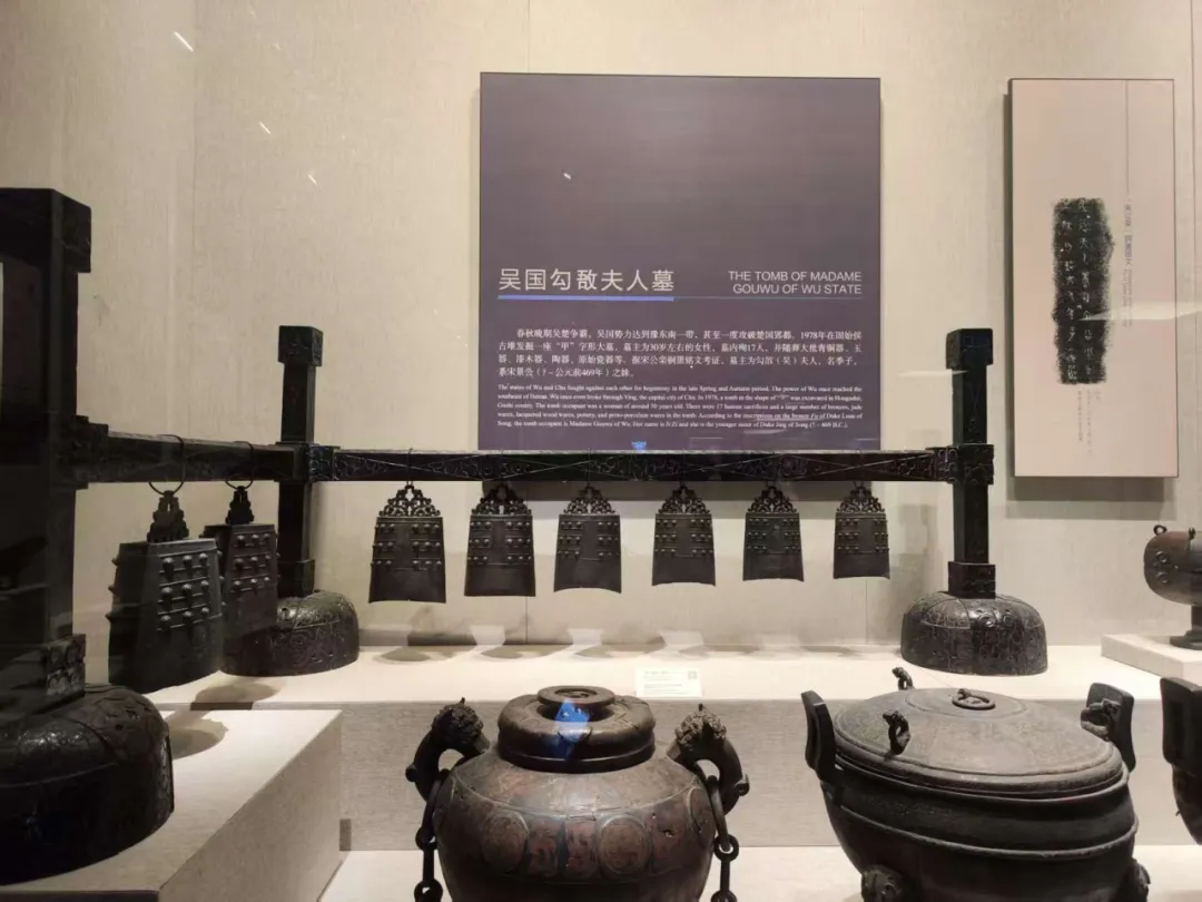 河南省博还有吴国的墓葬,为什么?吴王夫差娶了宋景公的妹妹勾吾夫人,伐楚时候夫人随军死在河南固始县,就地埋葬了。出土的钮钟上有铭文,墓葬还有十七个殉人。印证了史书上吴楚争霸,伍子胥报仇后,占领了河南东南部地区。
