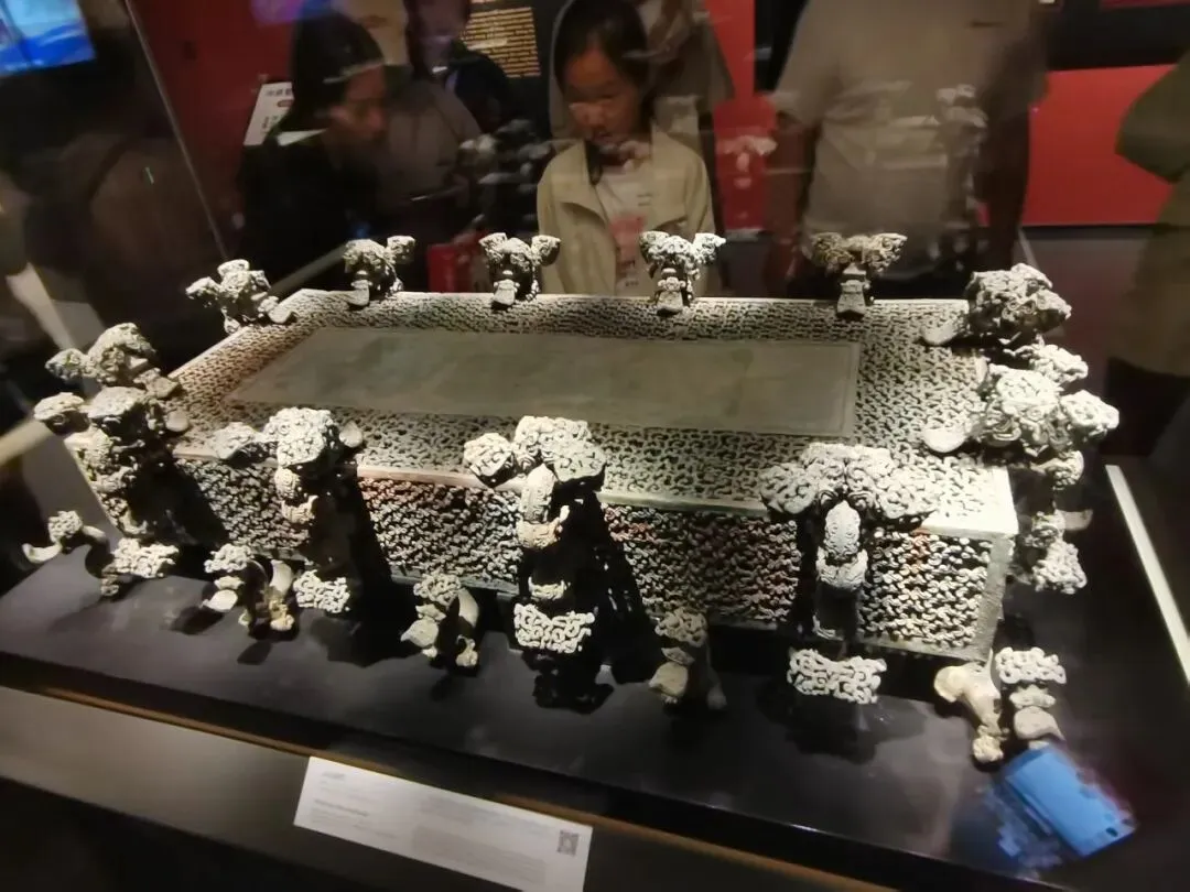这个叫俎的条案,镂空的桌面不失实用的前提下多了些艺术感。方壶本身满花,攀附两侧的龙张目四望,底部的虎足让器物多些灵动。