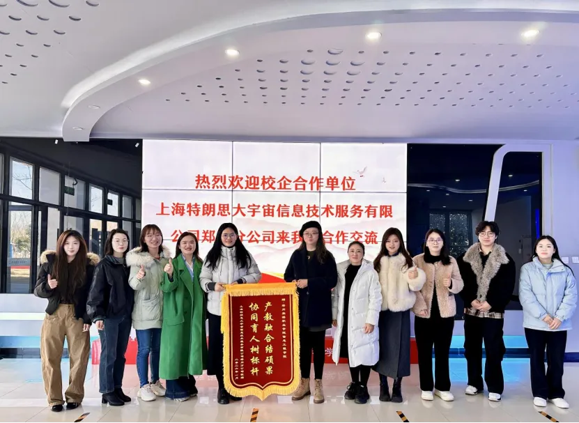 2026年1月9日,上海特朗思大宇宙信息技术服务有限公司郑州分公司招聘经理王敬丽一行莅临信息工程学院,专程赠送一面镌刻着“产教融合结硕果 协同育人树标杆”的锦旗,以此深切感谢学院在人才联合培养、产学研深度融合等领域给予企业的鼎力支持。信息工程学院院长潘宁、副院长张洁、教工党支部书记王桂凤、实习就业办公室代主任朱锦及专业教师郭怡静热情接待了企业来宾,双方就深化校企合作事宜展开深入交流。