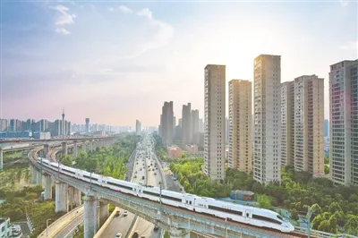 在陇海快速路与东三环交叉口西北角,穿梭在高楼林立间的高铁 记者 李新华 摄
