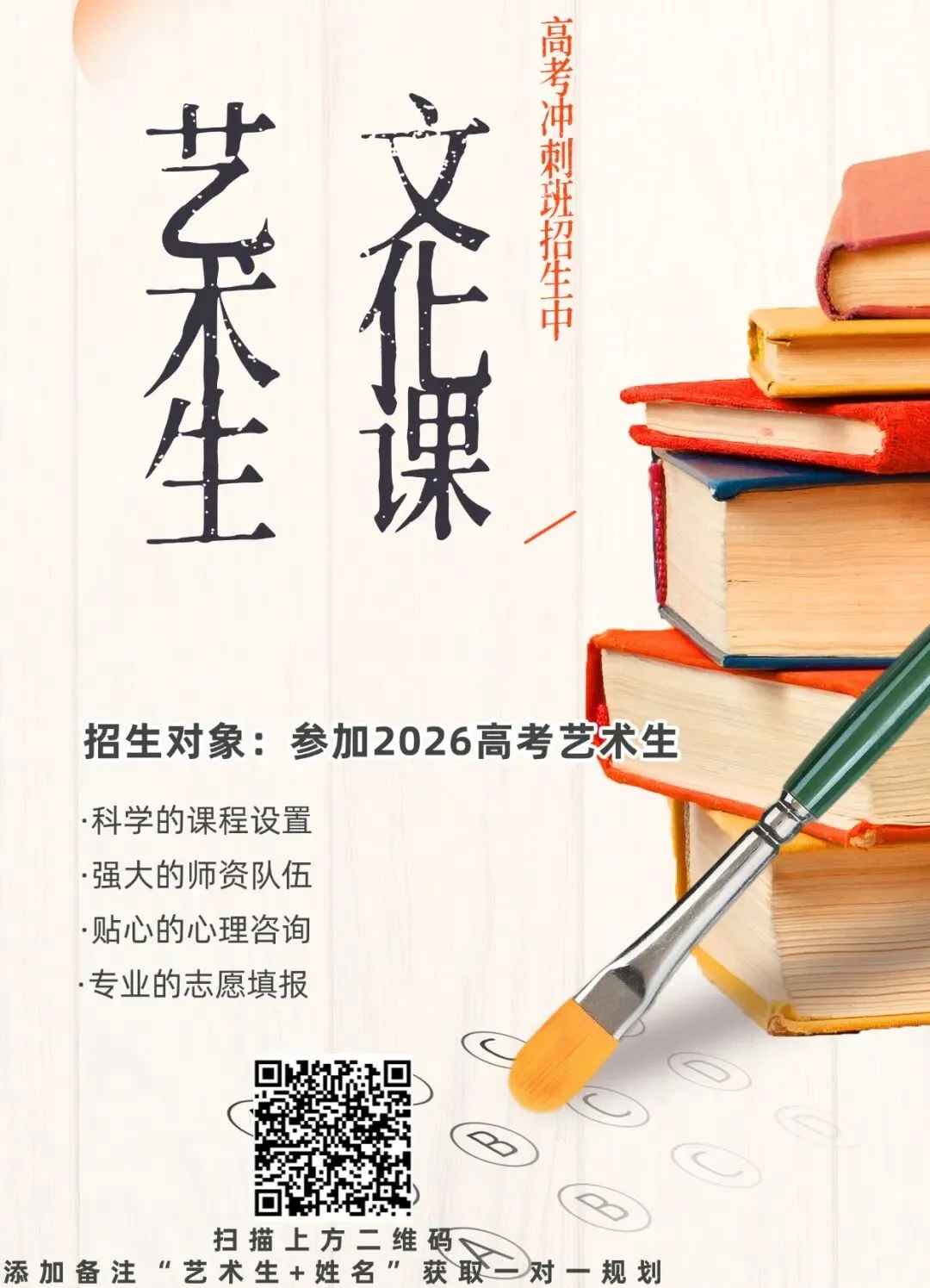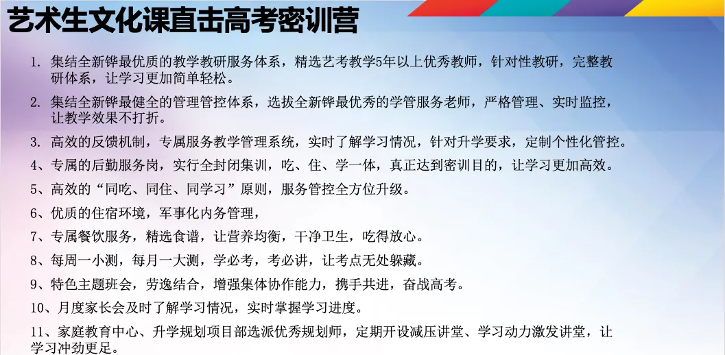 为此,创办了艺术生全日制文化课集训营,重点考点专题+一轮复习+二轮复习,帮助艺考生们梳理掌握各科知识点、做题方法和技巧,全力支持高三艺考学子突击高考!