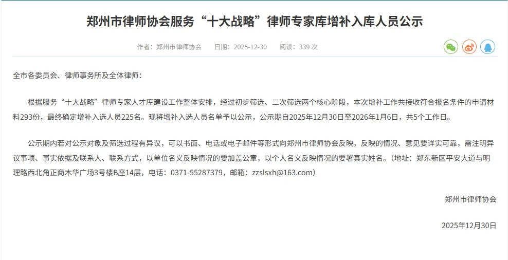 近日,郑州市律师协会正式发布《服务“十大战略”律师专家库增补入库人员公示》。历经初步筛选、二次筛选等多轮严格评审,全市最终确定225名增补入库人员。其中,北京浩天(郑州)律师事务所4位律师凭借扎实的专业能力与丰富的实务经验成功入选——徐瑞聪、璩晓平律师成功入选“政府与国企服务”子库,马华杰律师跻身“科技创新”子库,彭逸豪律师入选“专精特新与知识产权”子库。