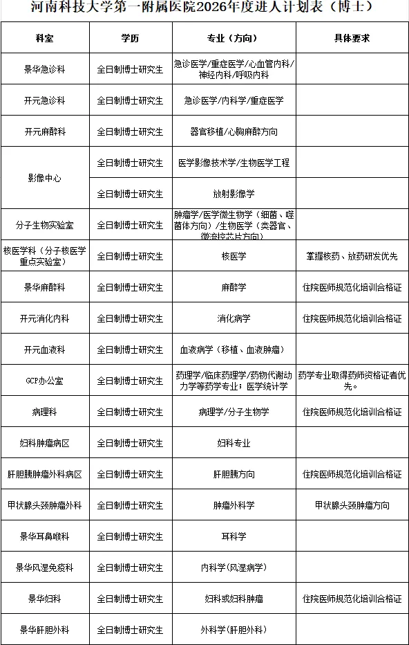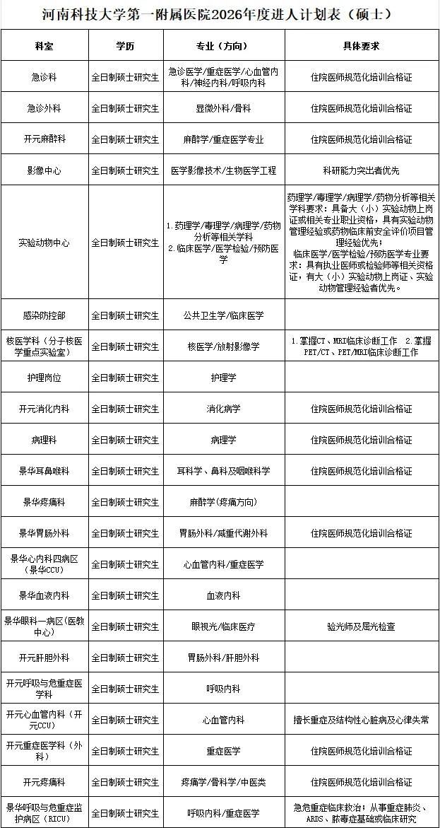 根据医院发展需要,现面向社会公开招聘人才。岗位及要求详见《河南科技大学第一附属医院2026年度博士进人计划表》(附件1)、《河南科技大学第一附属医院2026年度硕士进人计划表》(附件2)。