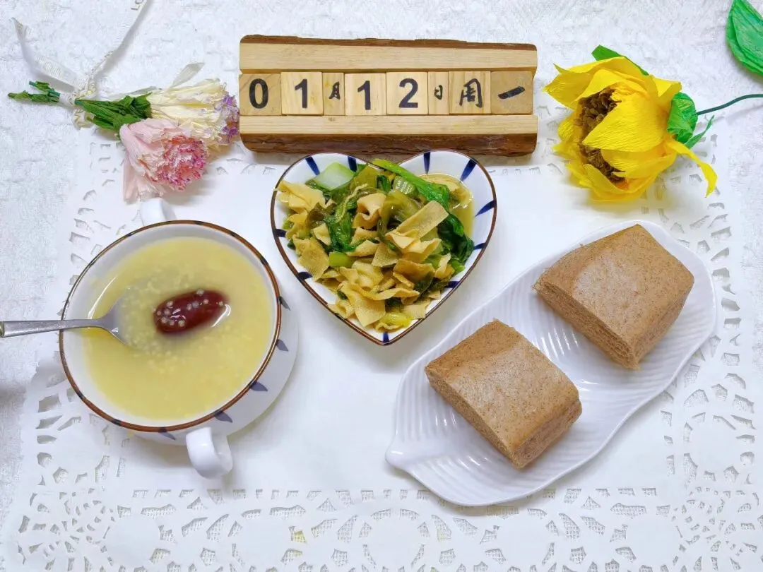 小白菜炒豆皮、高粱馒头、小米红枣粥