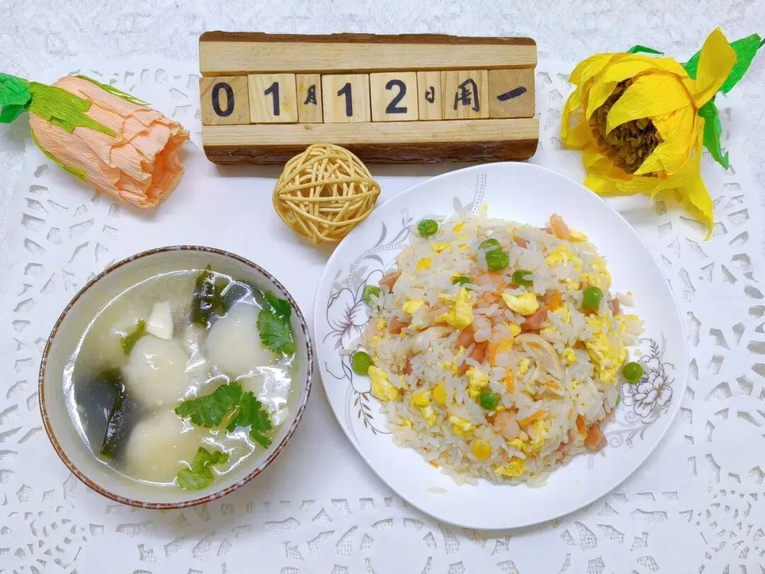 五彩炒米、裙带菜鱼丸汤