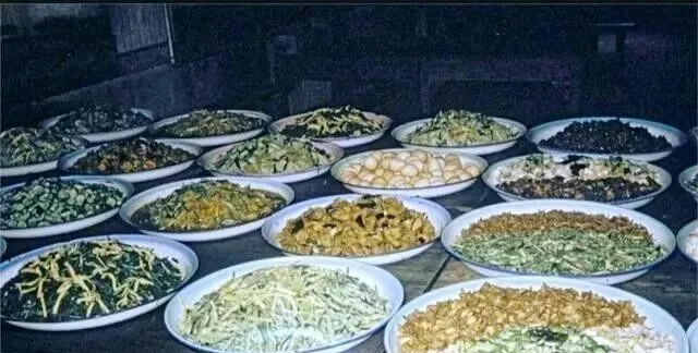 这桌全是菜,凉的热的一溜摆开,白瓷大盘挨着大盘,青菜、豆芽、肉丁、丸子,挑哪个都不寒碜,小时候跟着大人打饭,最爱那勺带油花的土豆丝,端回来一拌就香,那时候讲究管饱也管口味,现在点外卖方便,可这股锅气味儿真难找回来了。