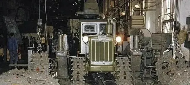 这张是履带车在装配线上缓缓滑行,链节一节一节压过去,顶上的吊链哗啦啦作响,灯泡把车身照成了白亮,工人们在两侧盯着尺寸,拧螺栓的手一刻不停,厂房不豪华,设备也仗义,踏实做活,机器就一步步往前挪。