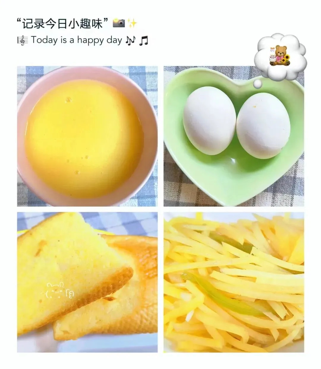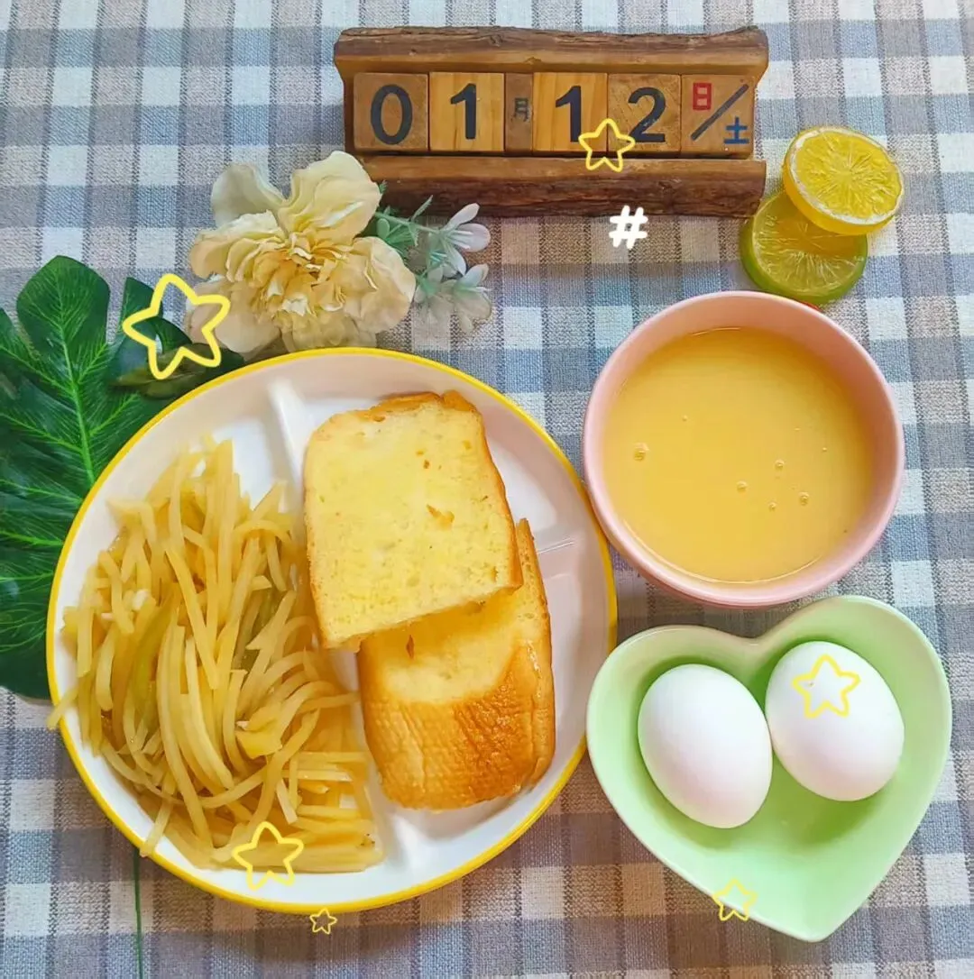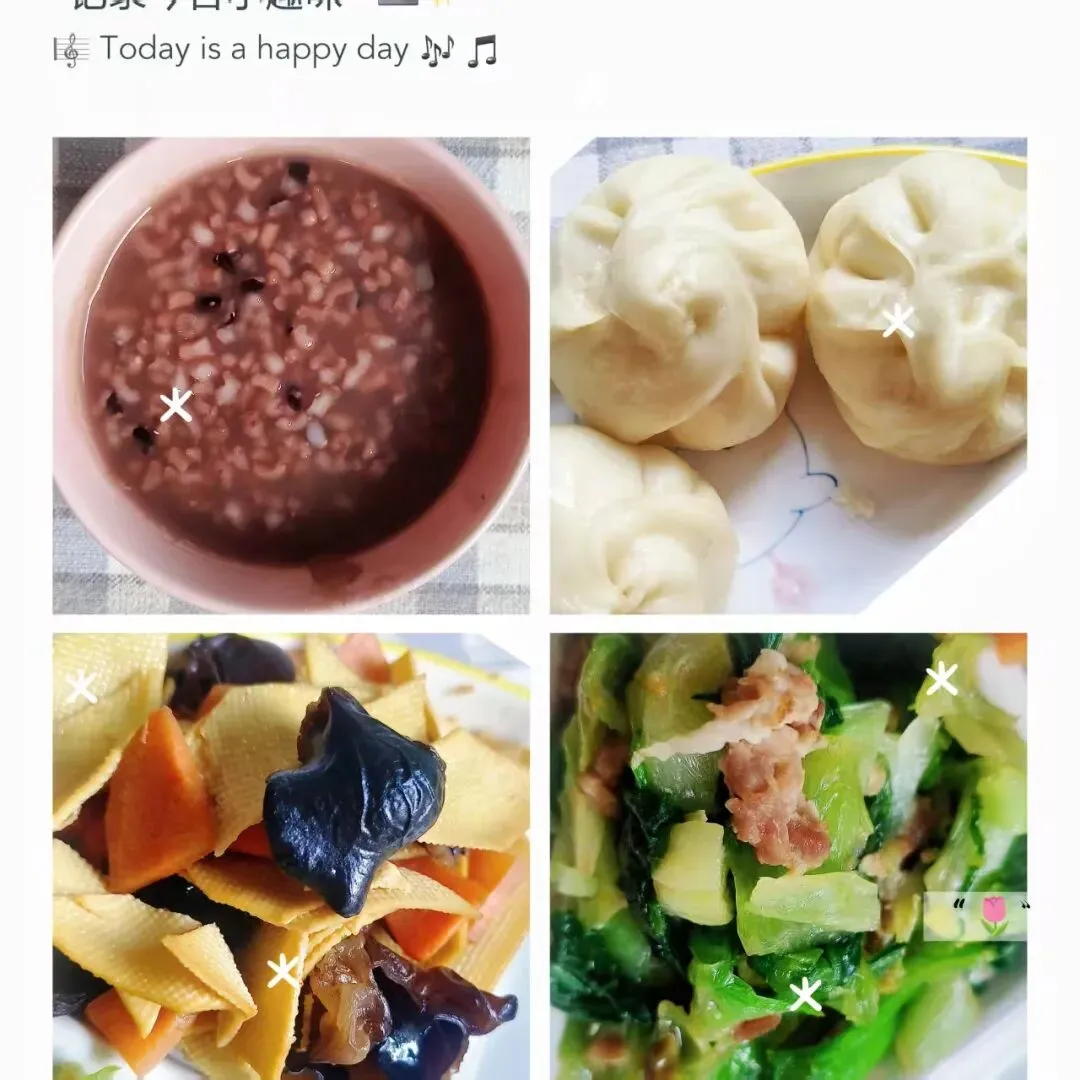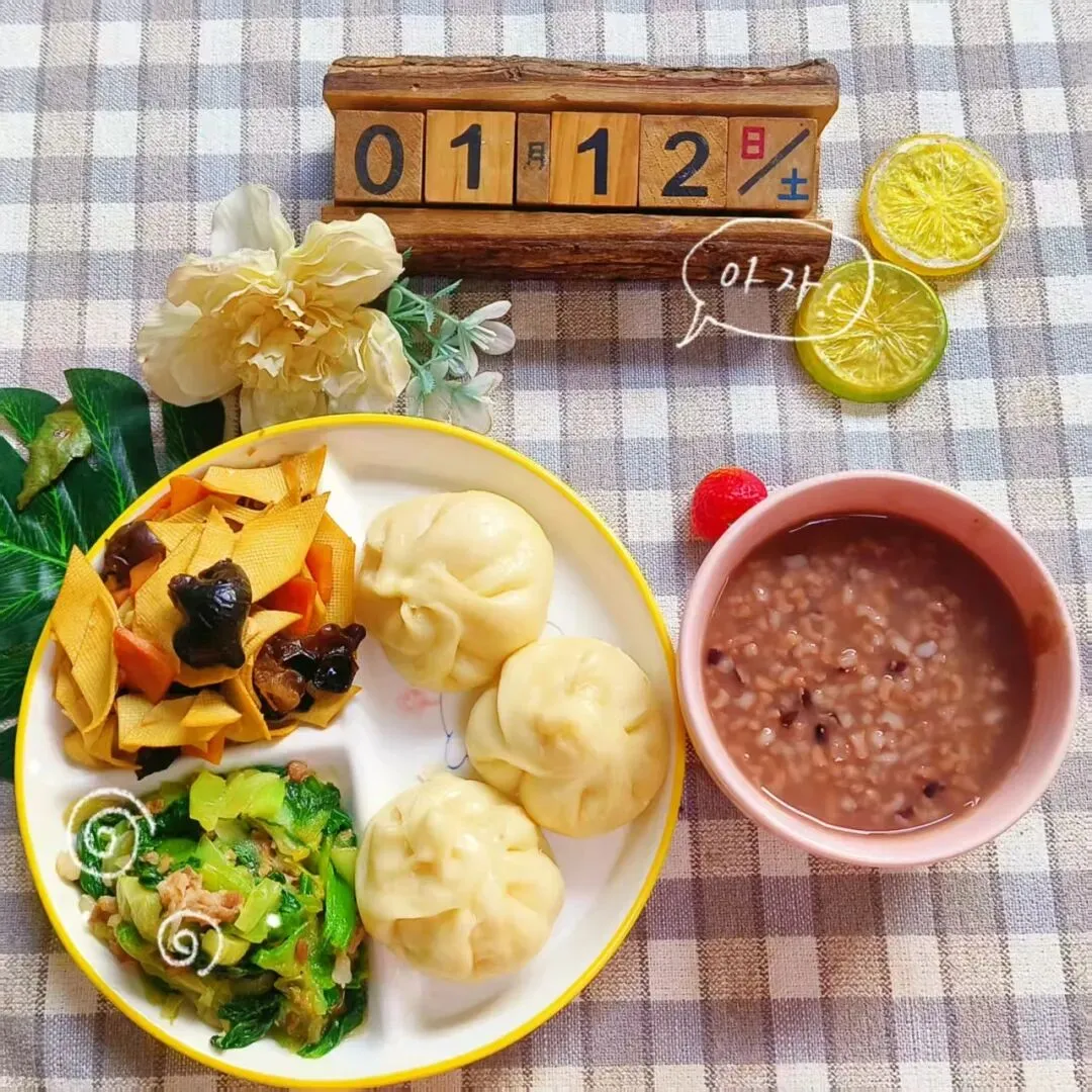 营养黑米粥 肉沫小油菜 胡萝卜木耳炒豆皮 香甜豆沙包