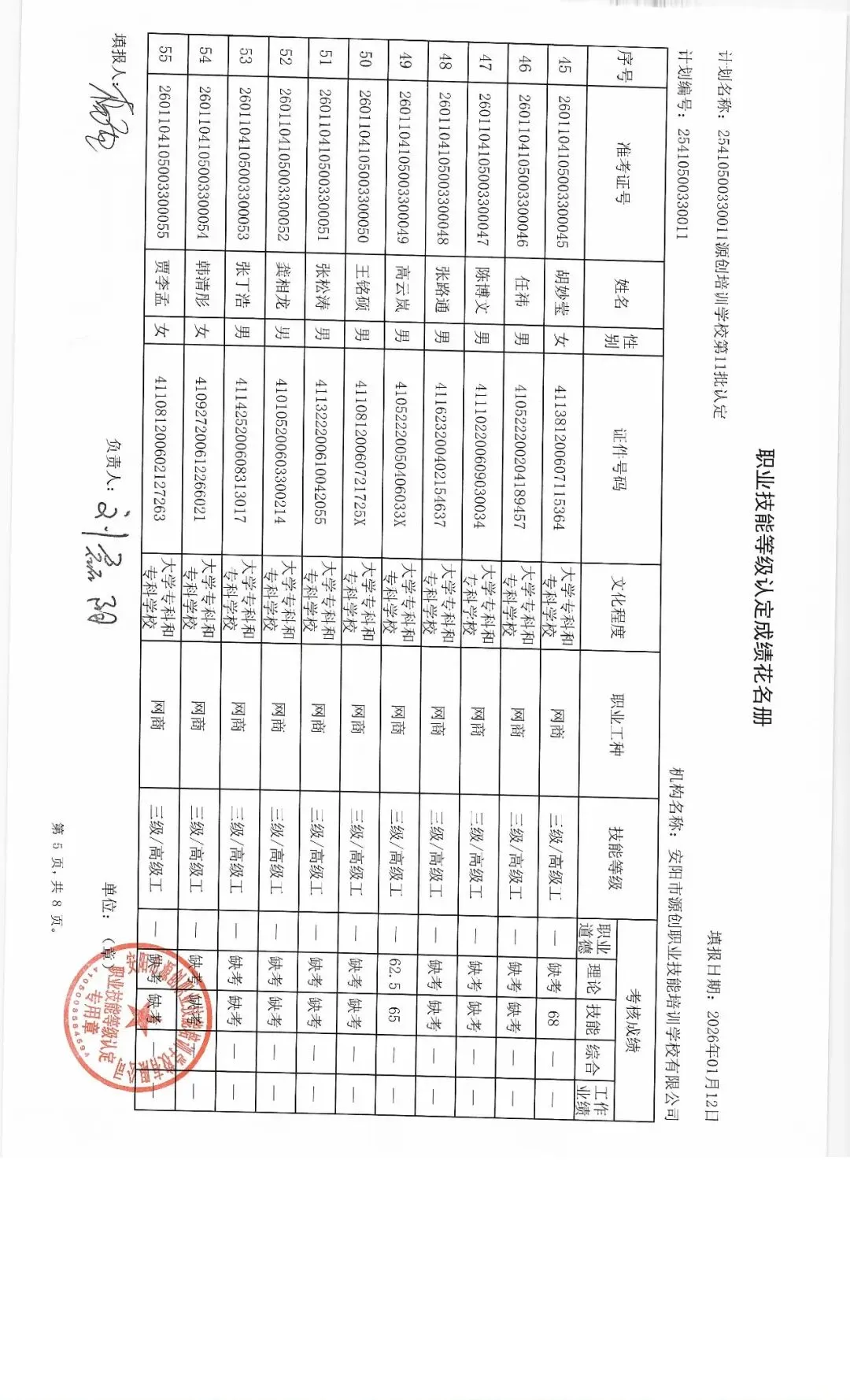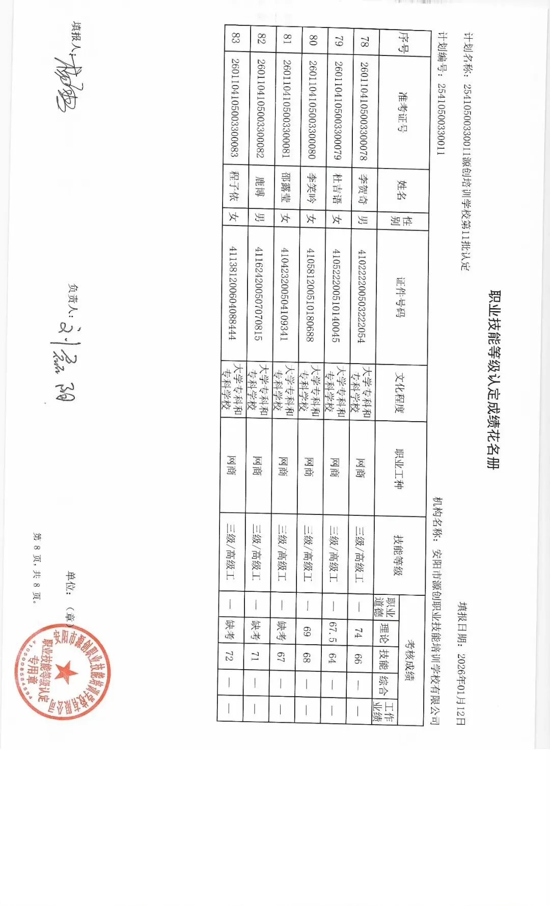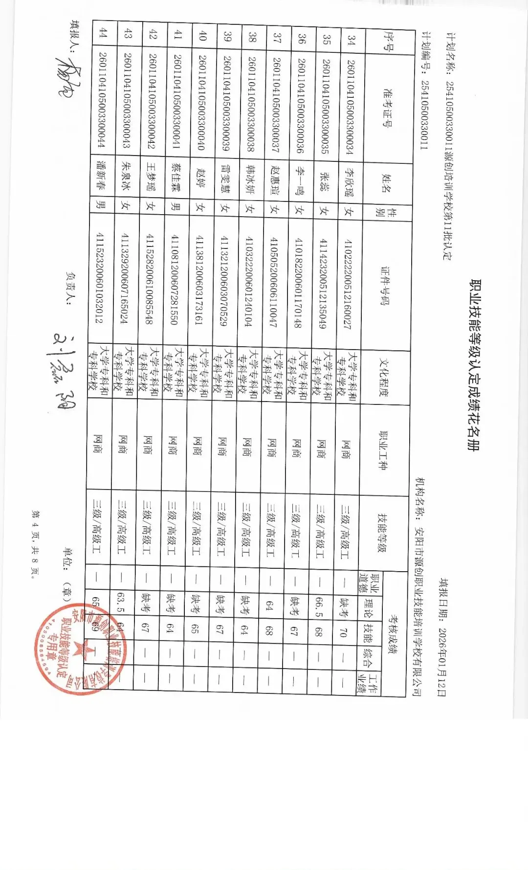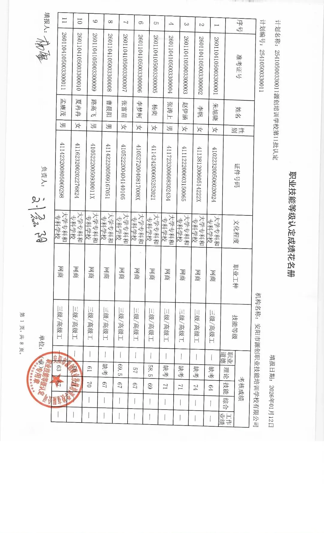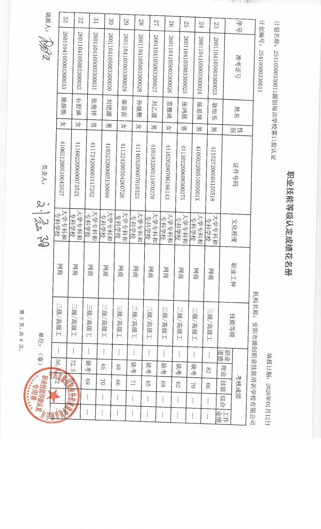 安阳市源创职业培训学校2025年第11批职业技能等级认定成绩公示