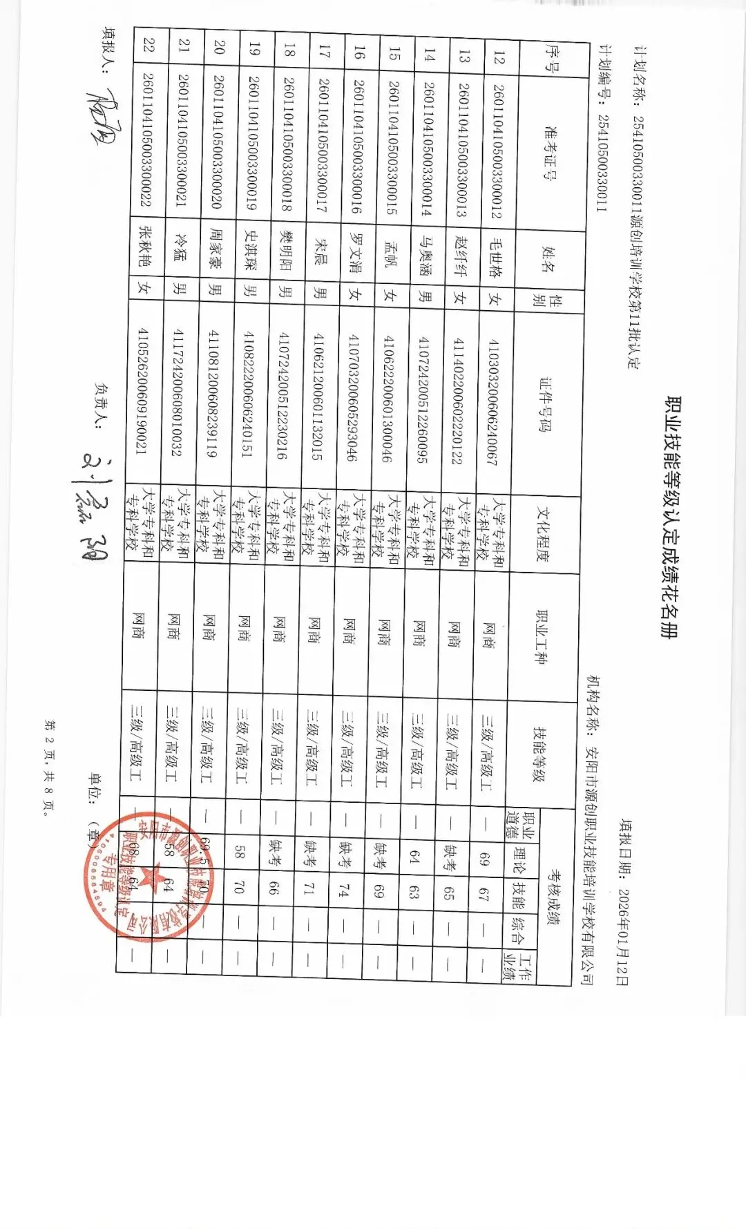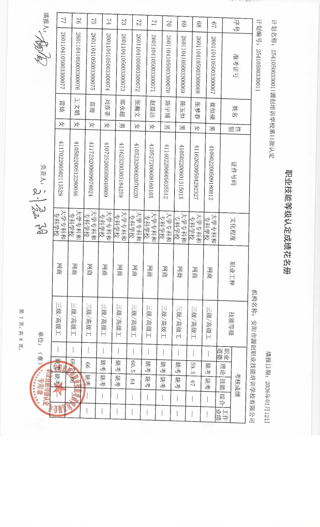 2026年1月10日安阳市源创职业技能培训学校第11批职业技能等级认定工作圆满结束,本批考试学员共计83人,考试职业工种为高级电子商务师现将考试学员成绩予以公示。