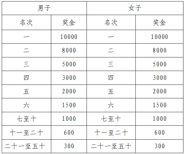 半程马拉松项目150元人民币/人。