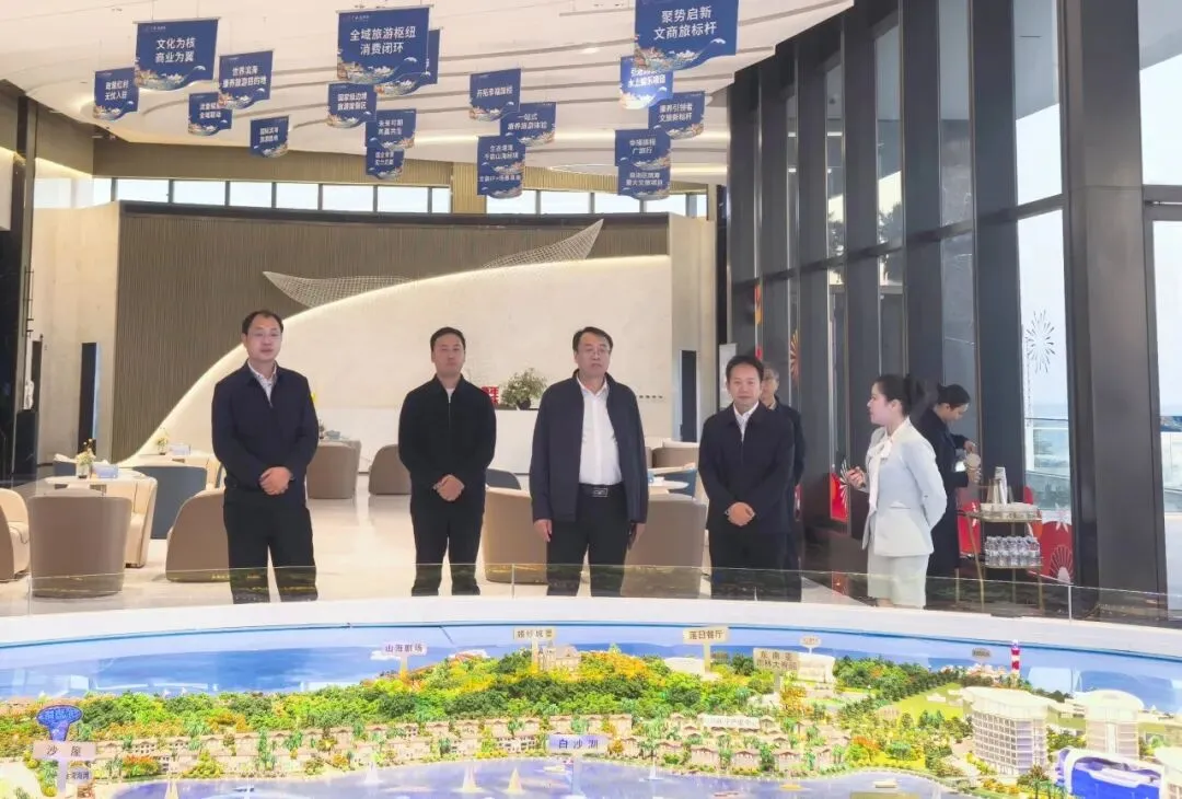 调研组在广旅·白沙湾展示中心详细听取了白沙湾项目的建设及运营管理情况,深入了解各业态功能布局、运营计划及经营特色,对其滨海度假、康养医疗及运动休闲的多元业态融合给予高度评价。