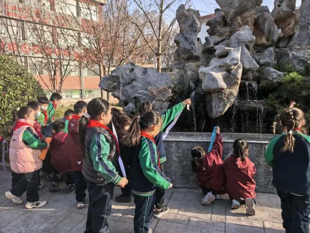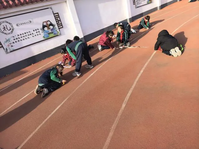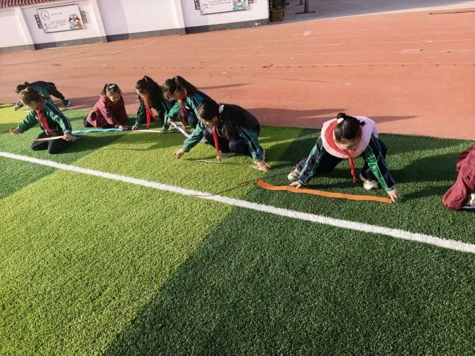 看,操场上,二年级的孩子们正专注地忙碌着。他们手拿尺子,化身小小测量师,认真地丈量着跑道的宽度、国旗台的尺寸……校园的每一个角落都变成了他们的探究乐园。