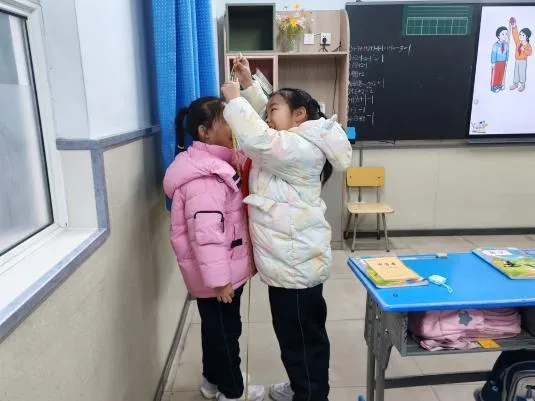 在学习厘米、米等标准单位时,孩子们对古人如何用身体部位进行测量就产生了浓厚兴趣。掌握了基础测量技能后,他们便迫不及待地开始了首次实践探索。