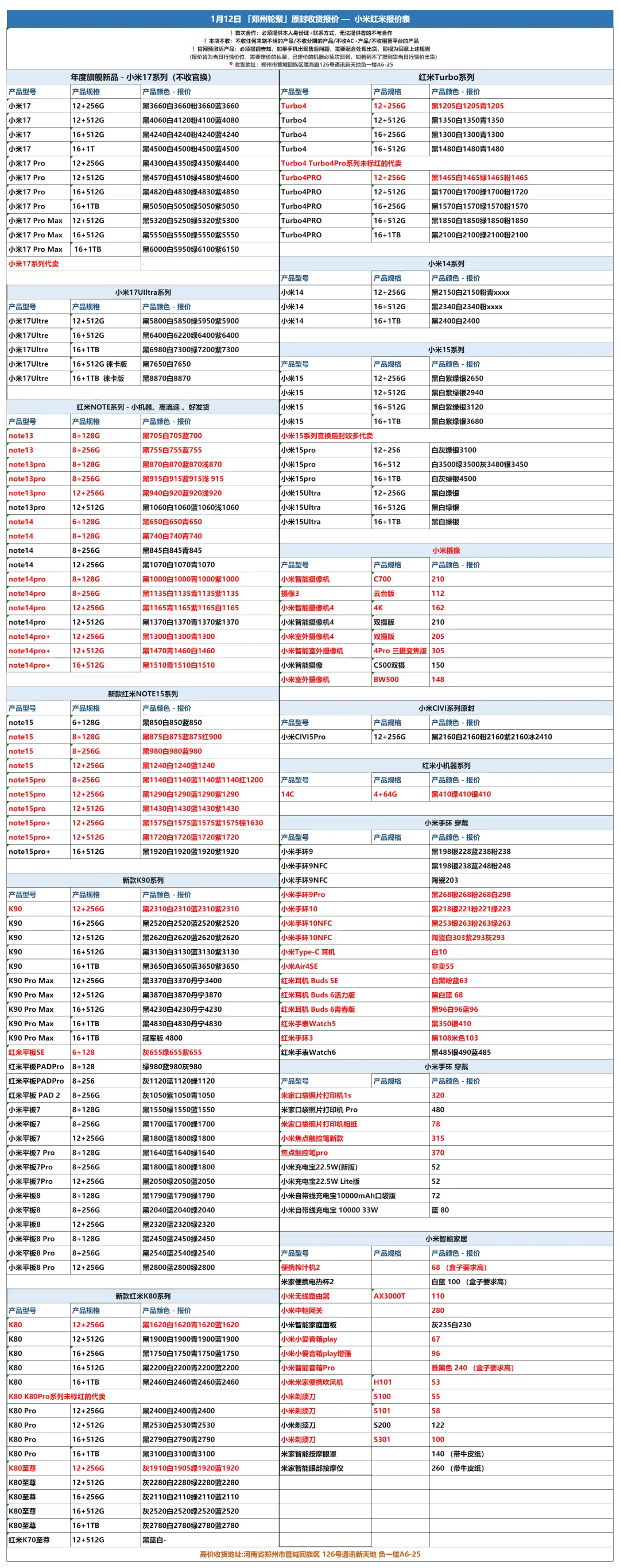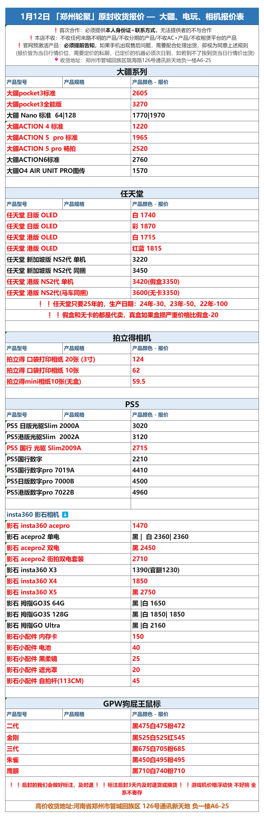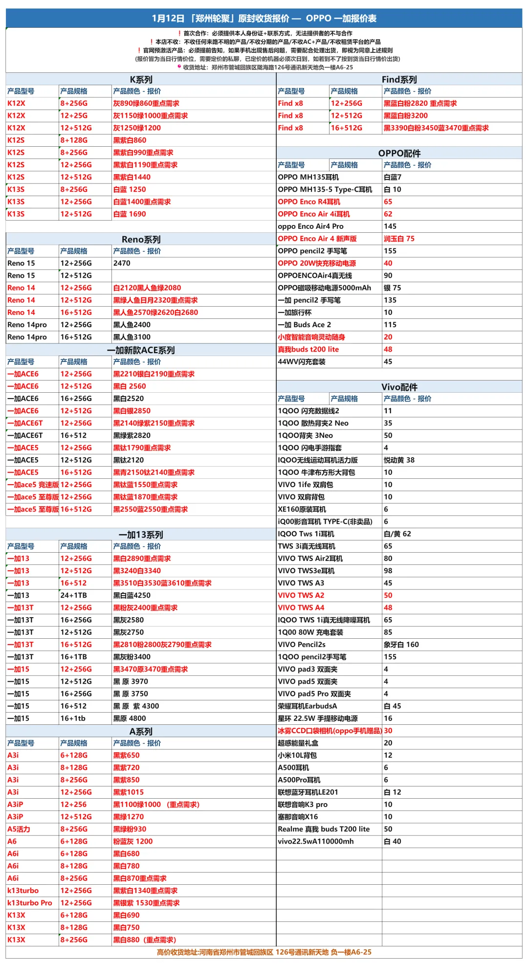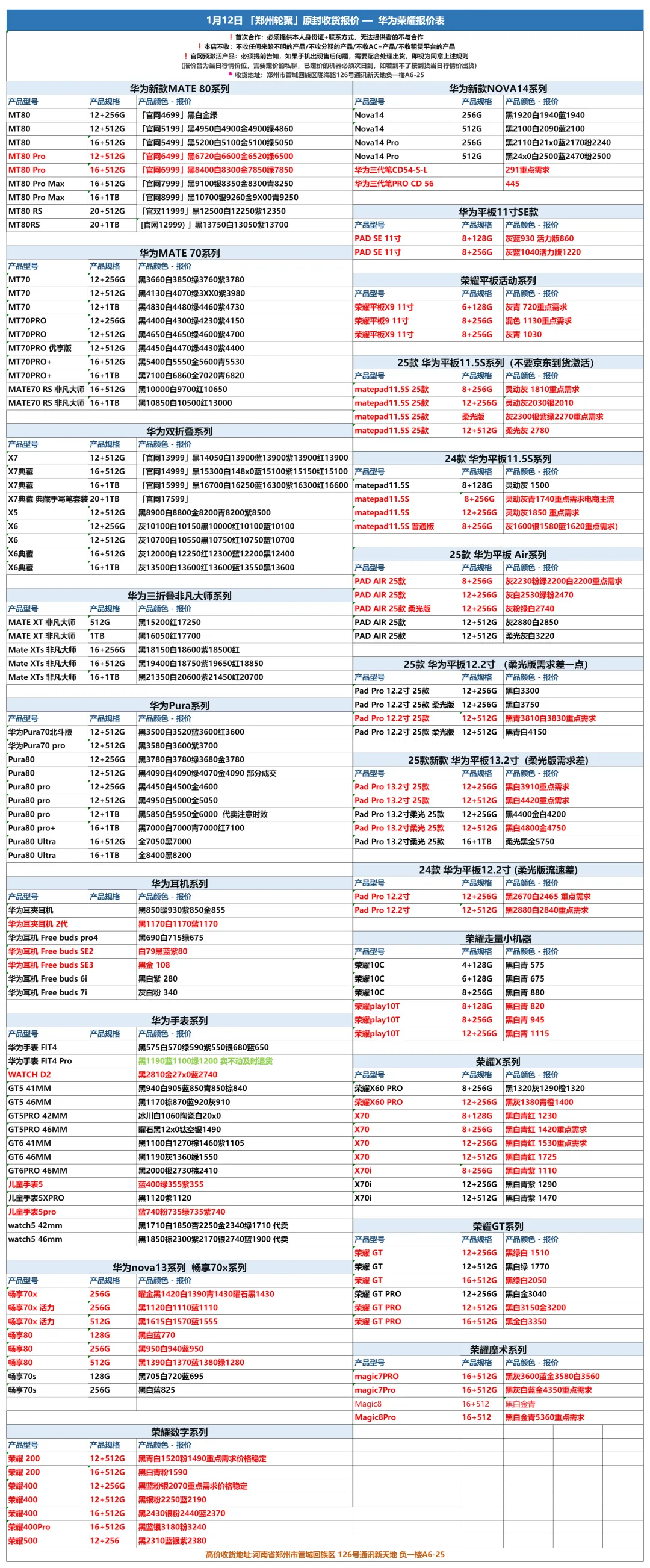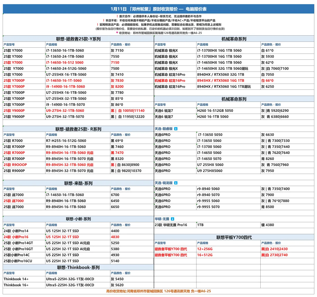 郑州轮聚通讯 2026年1.12日数码报价更新