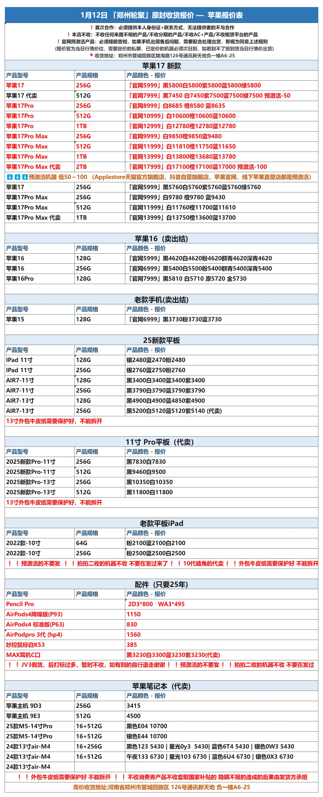 >郑州轮聚通讯 2026年1.12日数码报价更新