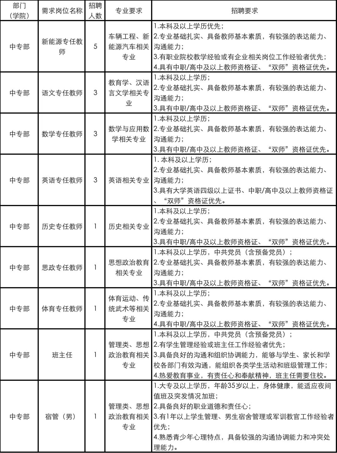 4.具有岗位所需要的专业和技能条件,具有统招本科及以上学历(特别优秀的可以放宽到统招专科);相应岗位需具有高职或中职教师资格证书(具体要求以《招聘岗位及具体要求》为准);