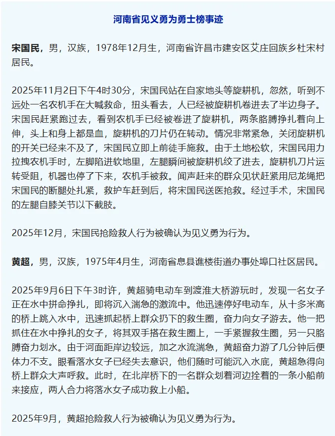 ●1月12日,中央政法委在京发布2025年第四季度见义勇为勇士榜,共有50位见义勇为勇士获通报表扬和奖励慰问。其中,河南两人入选,分别是宋国民和黄超↓↓。