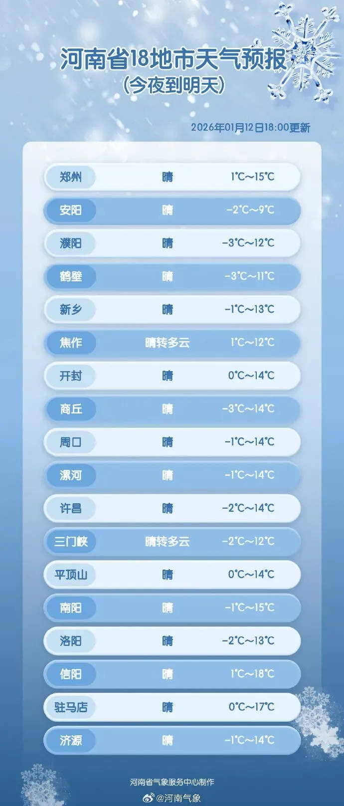 1月15日(星期四):晴天转多云 4~19℃(郑州市气象台)