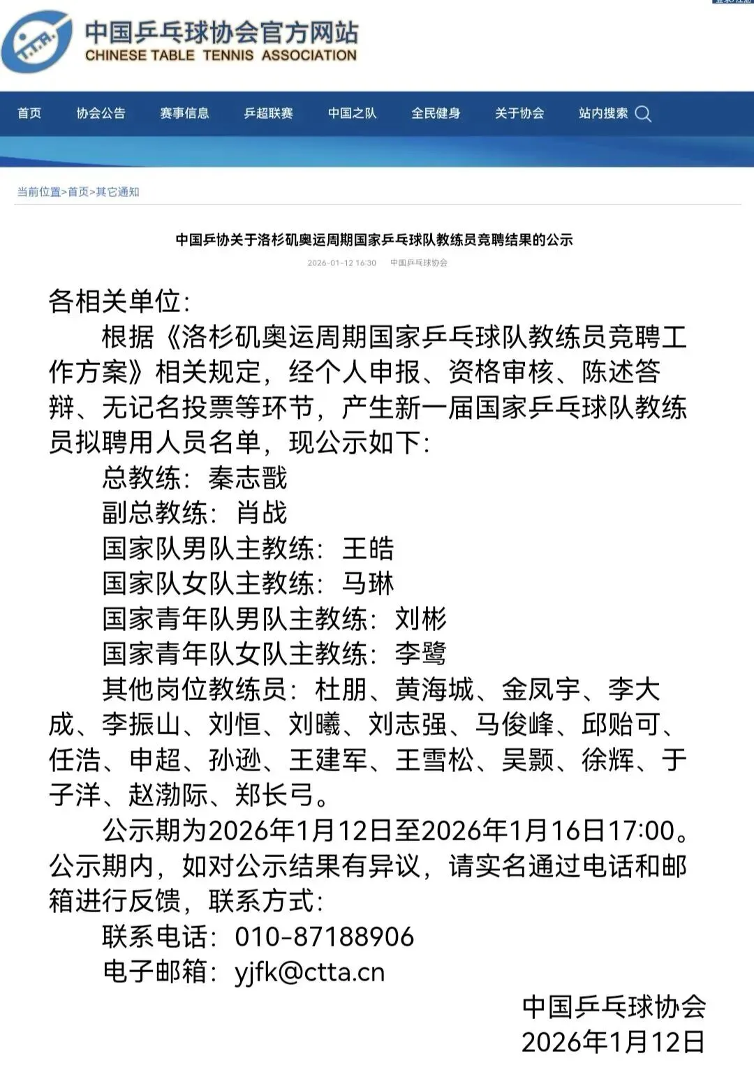 ●中国乒协官网12日公示洛杉矶奥运周期国家乒乓球队教练员竞聘结果,拟聘秦志戬为总教练、肖战为副总教练、王皓为男队主教练、马琳为女队主教练。