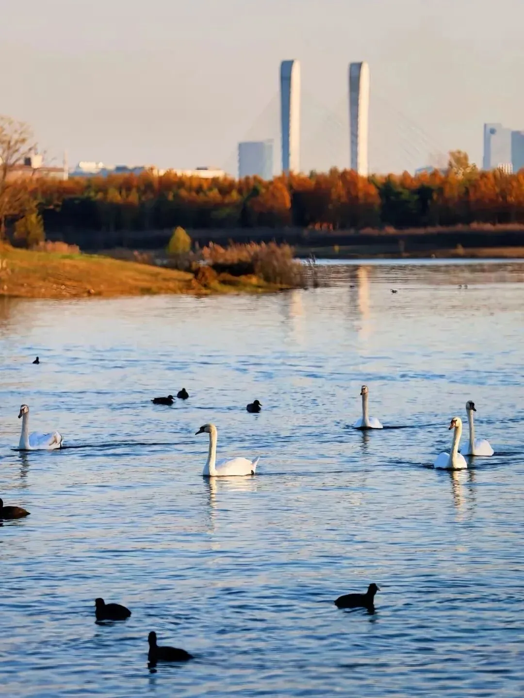 我特别喜欢傍晚时分在湖边散步,夕阳西下,湖面波光粼粼,远处的建筑倒映在水中,美得像一幅画。这里还有专门的自行车道和慢跑道,非常适合运动爱好者。更难得的是,湖中还有黑天鹅、野鸭等野生动物,说明这里的生态环境真的很好。
