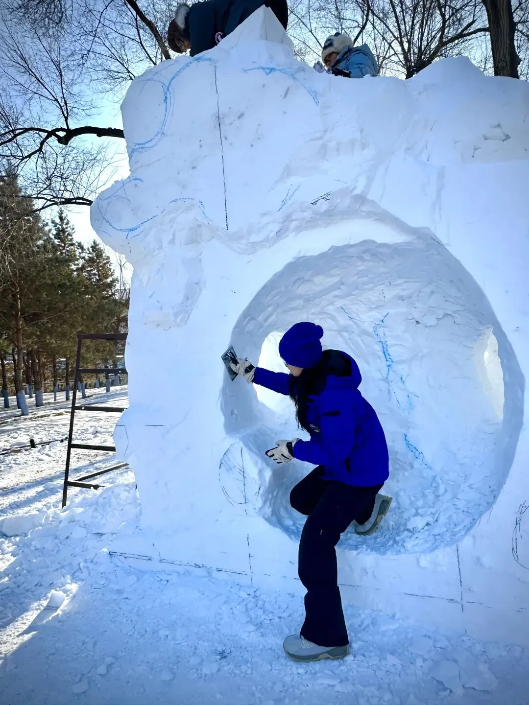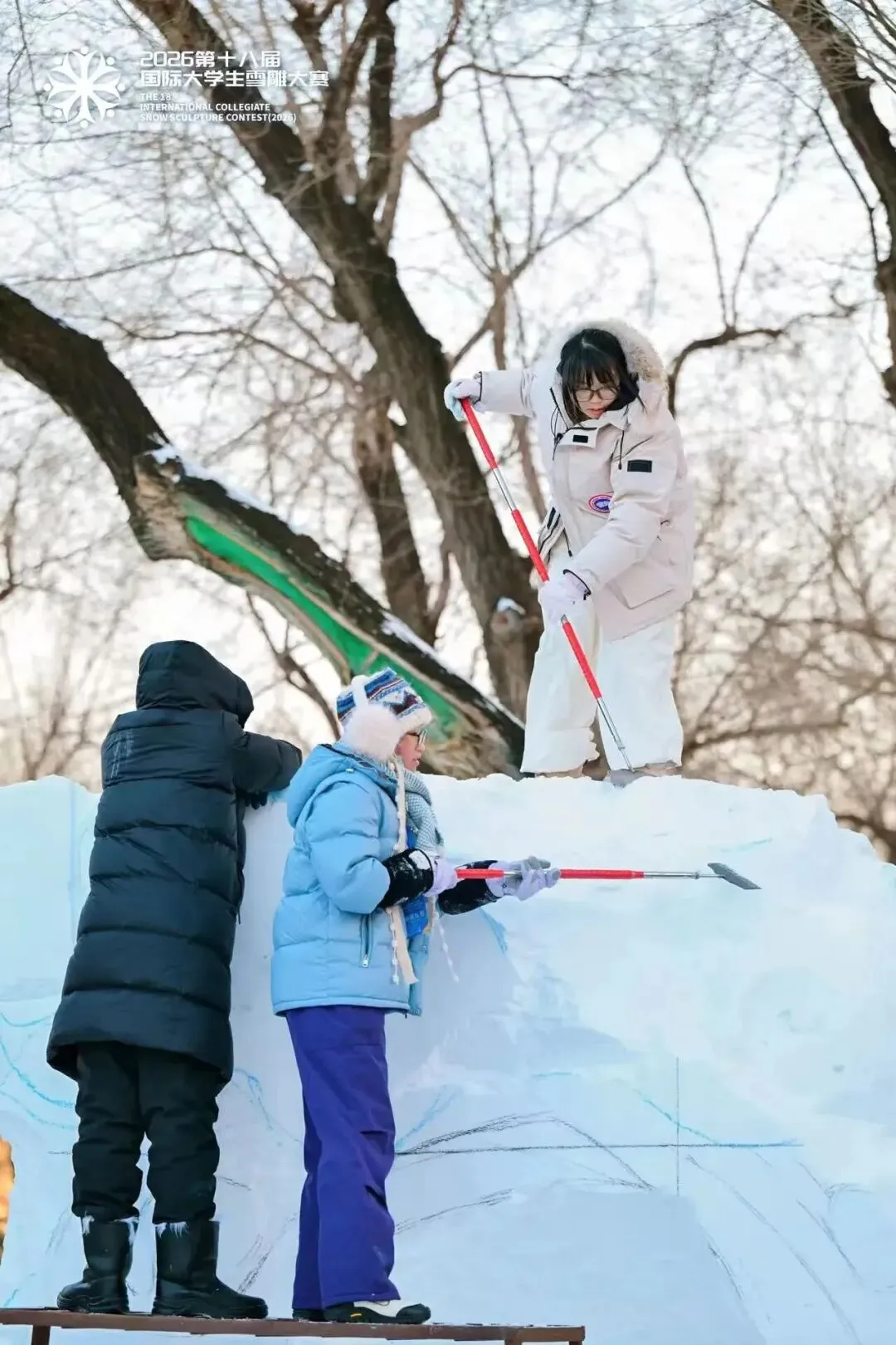 对于准备参加雪雕竞赛的师生,董浩宇分享了个人的三点参赛建议。第一,作品构思阶段要尽早找到创意与实现性的平衡点。建议准备阶段多做推敲模拟,避免方案过于复杂导致现场推进困难。第二,在团队组建与协作中,前期沟通和信任建立至关重要。赛前需充分讨论,确保成员对作品核心意图达成共识。第三,在个人心态与准备上,要做好迎接体力与意志双重挑战的准备。比赛强度大,严寒环境考验身心,需保持良好体能并管理好情绪与心理预期。”