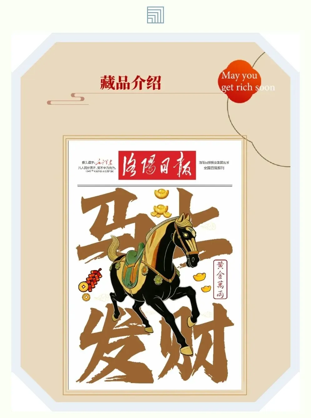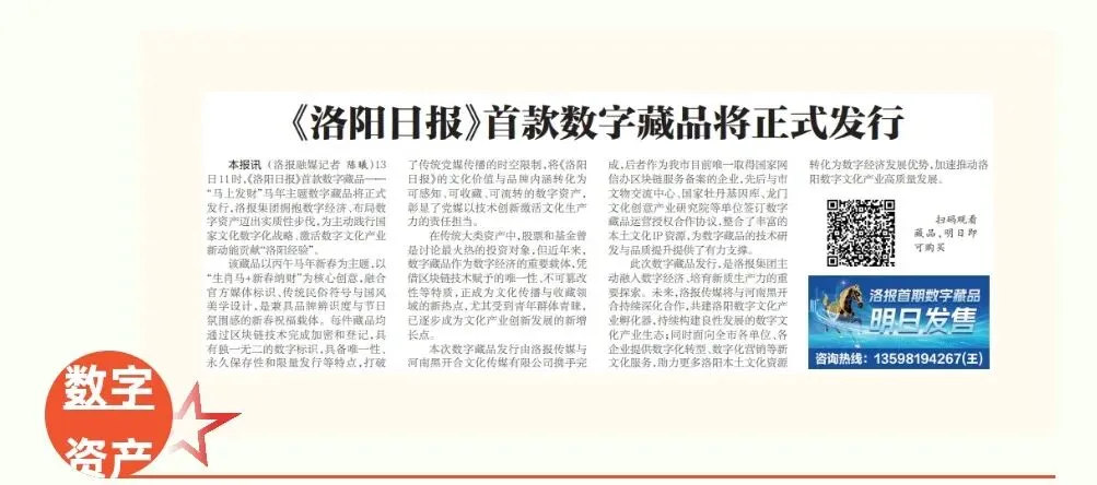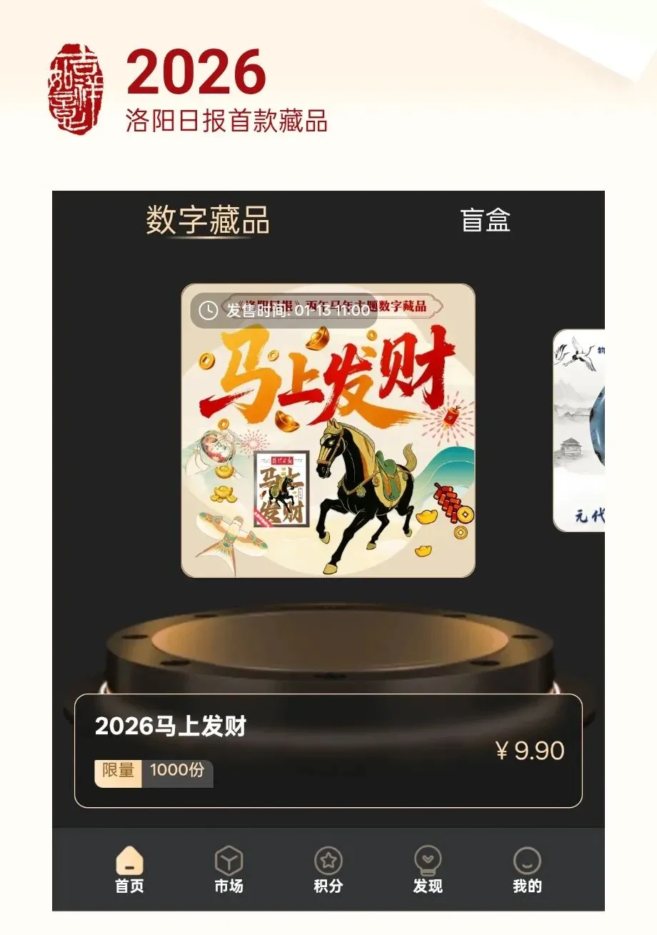 2026年1月13日11时,《洛阳日报》首款数字藏品“马上发财”马年主题藏品将正式发行。这是洛报集团拥抱数字经济、布局数字资产的重要举措,也为洛阳数字文化产业发展注入了全新活力。