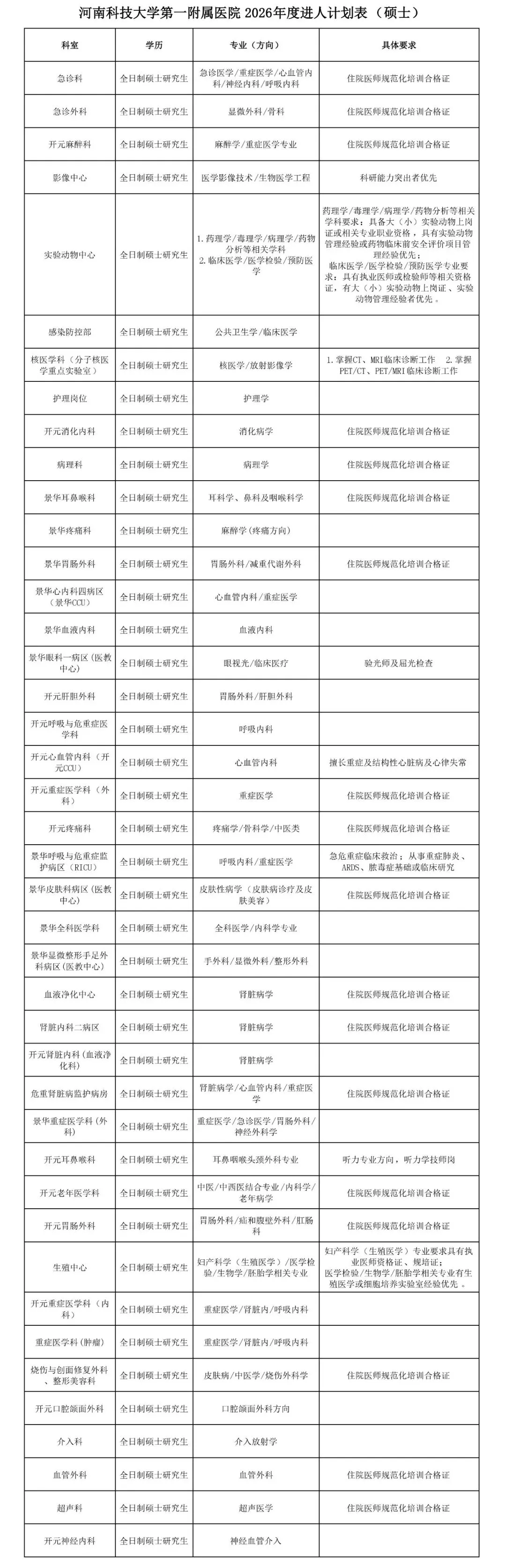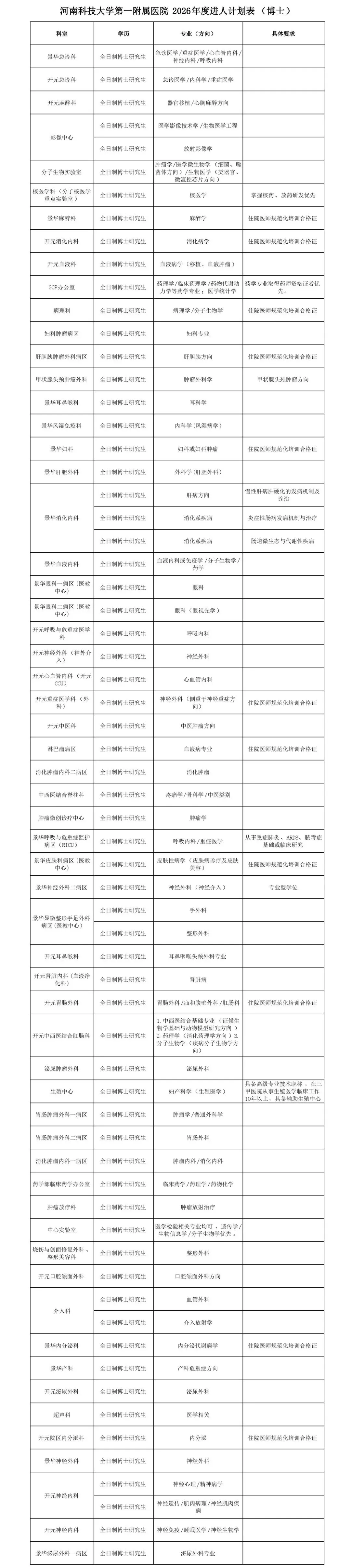 根据医院发展需要,现面向社会公开招聘人才。岗位及要求详见《河南科技大学第一附属医院2026年度博士进人计划表》(附件1)、《河南科技大学第一附属医院2026年度硕士进人计划表》(附件2)。