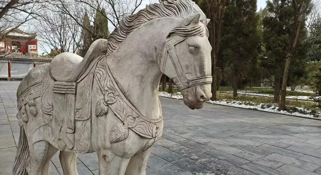 白马寺山门,即是入口,是明代所建。山门外有两匹著名的石雕白马,是为了纪念由印度驮经书返回洛阳的两匹白马而立,石马为宋代遗物,形态温和、雕工细腻。白马寺面积不大,但布局规整。寺院坐北朝南,前后五重大殿都坐落在一条中轴线上。