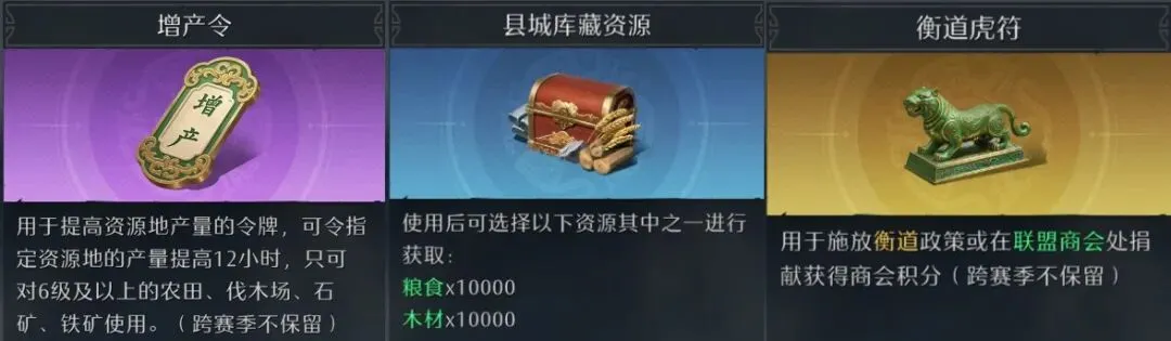 最重要的就是存满粮草!包括屯田令、增产令等道具,还有战功、褒奖令等代币,千万要存够数量,不要提前消耗!还要刷完民居和南蛮,备足虎符和自选资源箱!避免因缺少道具而无法发动政策!