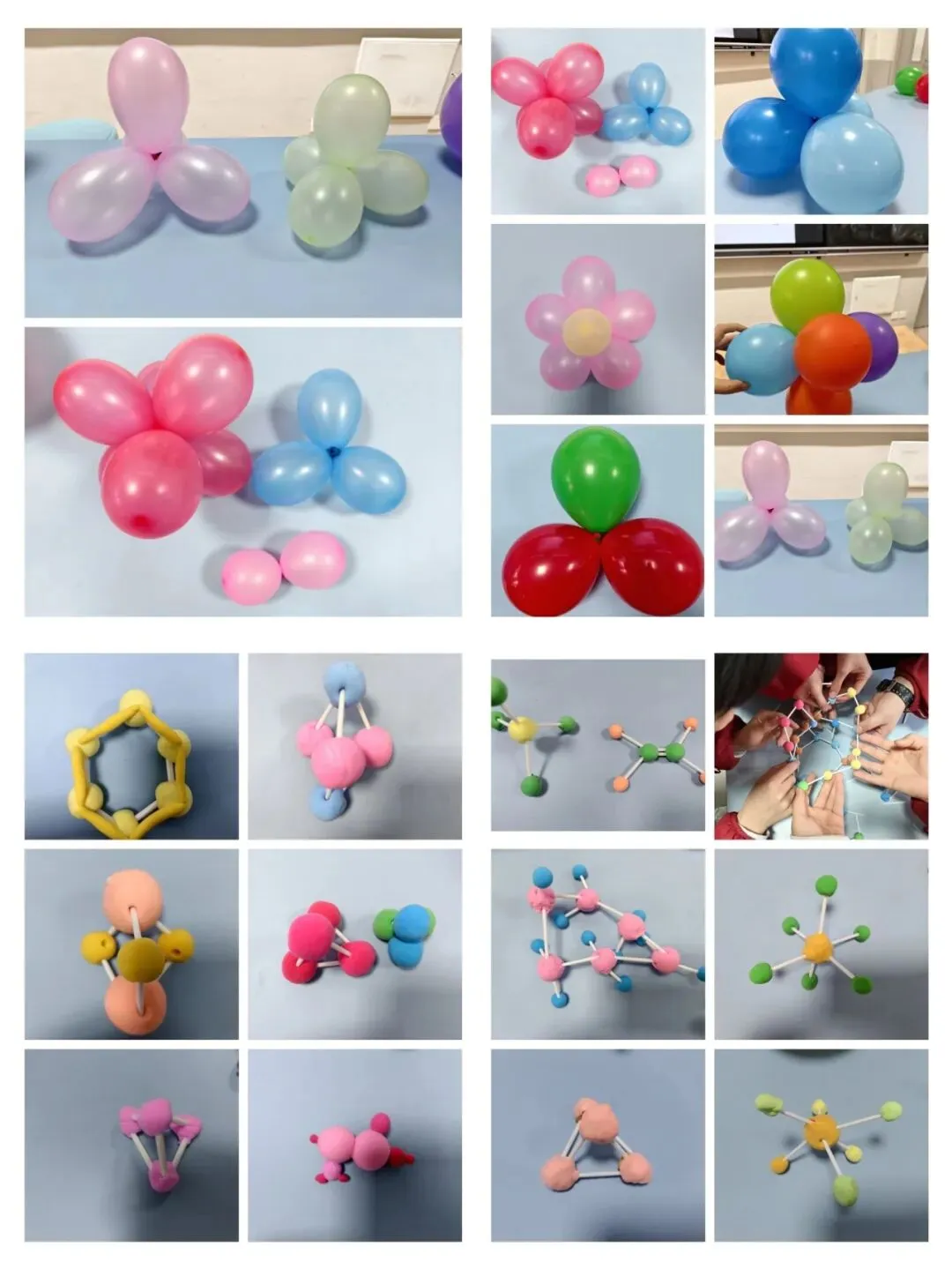 活动中,同学们以气球为材料,亲手组装出立体的杂化轨道模型,直观感知轨道的空间构型;再用小棍与粘土搭建分子模型,从熟悉的甲烷、乙烯,到颇具挑战性的足球烯,五彩的模型让抽象的理论知识变得触手可及。